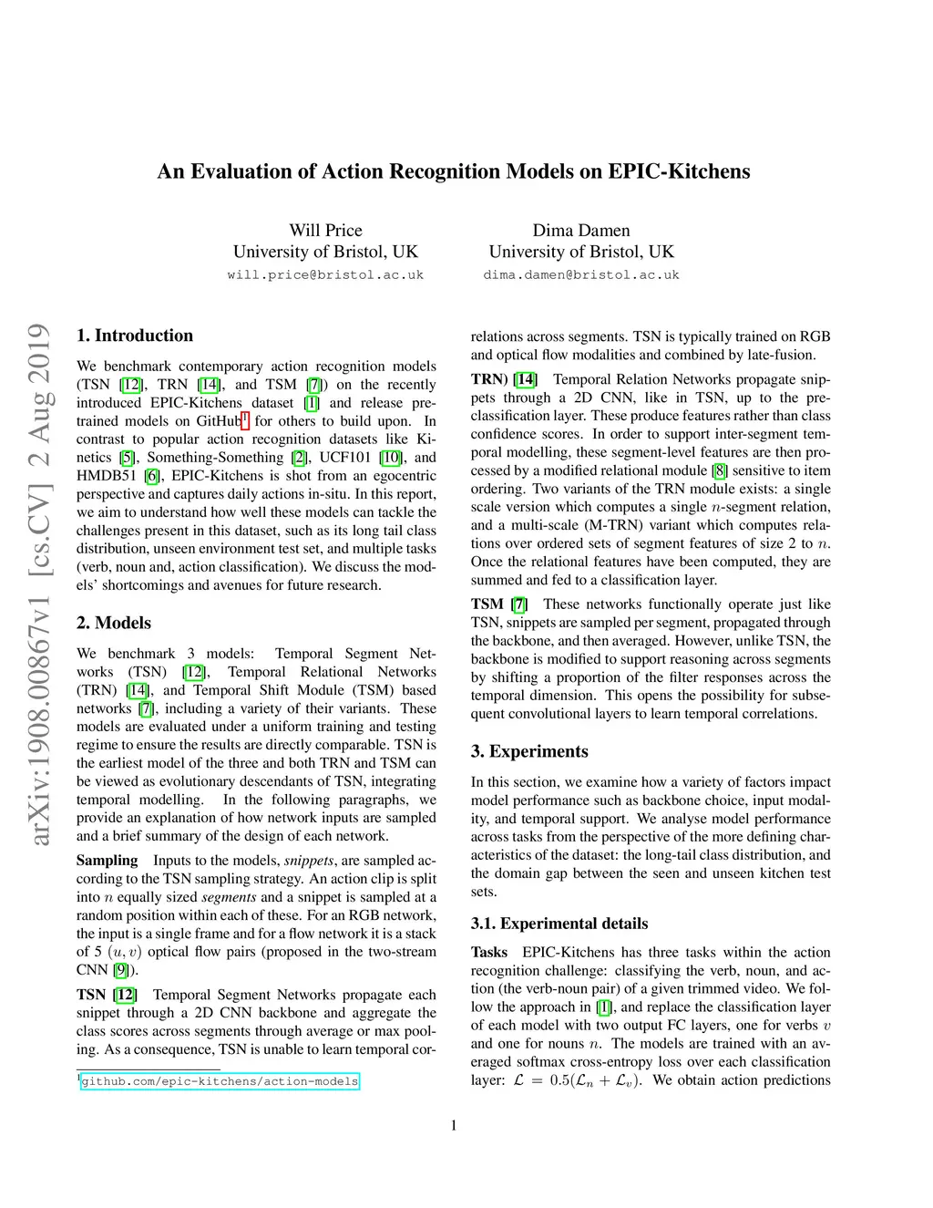 We benchmark contemporary action recognition models (TSN, TRN, and TSM) on the recently introduced EPIC-Kitchens dataset and release pretrained models on GitHub (https://github.com/epic-kitchens/action-models) for others to build upon. In contrast to popular action recognition datasets like Kinetics, Something-Something, UCF101, and HMDB51, EPIC-Kitchens is shot from an egocentric perspective and captures daily actions in-situ. In this report, we aim to understand how well these models can tackle the challenges present in this dataset, such as its long tail class distribution, unseen environment test set, and multiple tasks (verb, noun and, action classification). We discuss the models' shortcomings and avenues for future research.