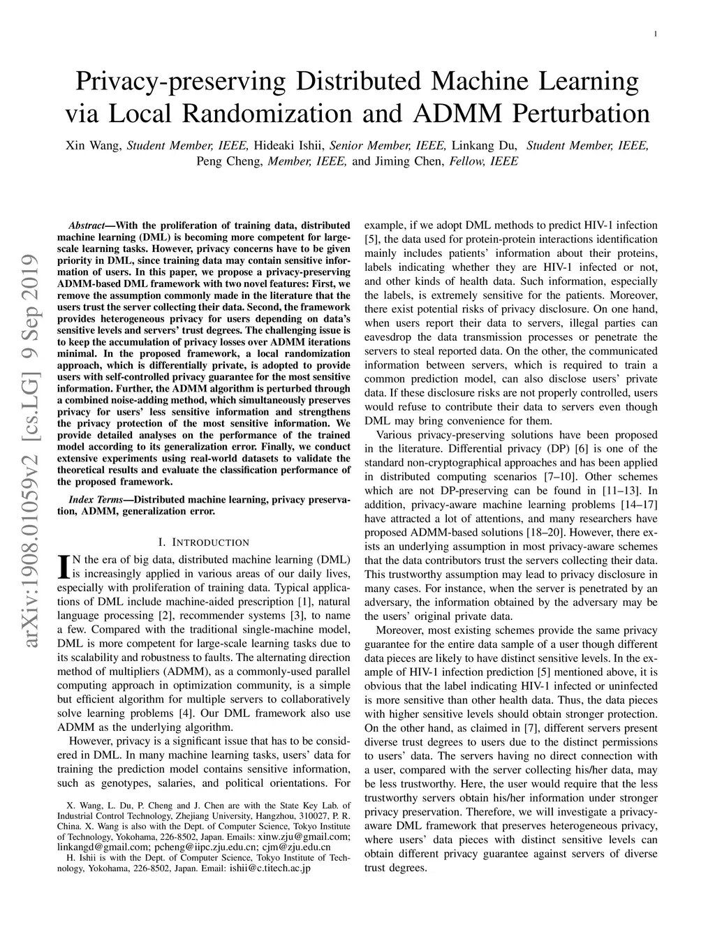 Privacy-preserving Distributed Machine Learning via Local Randomization