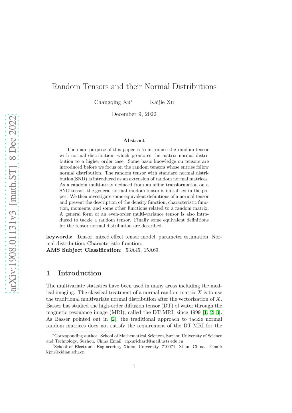 The main purpose of this paper is to introduce the random tensor with normal distribution, which promotes the matrix normal distribution to a higher order case. Some basic knowledge on tensors are introduced before we focus on the random tensors whose entries follow normal distribution. The random tensor with standard normal distribution(SND) is introduced as an extension of random normal matrices. As a random multi-array deduced from an affine transformation on a SND tensor, the general normal random tensor is initialised in the paper. We then investigate some equivalent definitions of a normal tensor and present the description of the density function, characteristic function, moments, and some other functions related to a random matrix. A general form of an even-order multi-variance tensor is also introduced to tackle a random tensor. Also presented are some equivalent definitions for the tensor normal distribution. We initialize the definition of high order standard Gaussian tensors, general Gaussian tensors, deduce some properties and their characteristic functions.