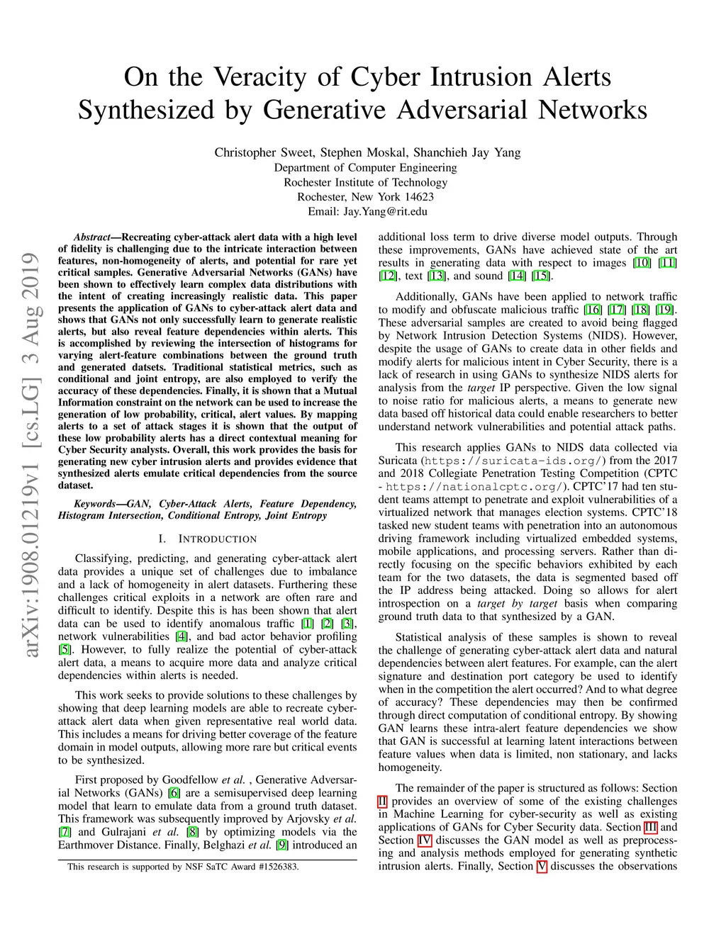 Recreating cyber-attack alert data with a high level of fidelity is challenging due to the intricate interaction between features, non-homogeneity of alerts, and potential for rare yet critical samples. Generative Adversarial Networks (GANs) have been shown to effectively learn complex data distributions with the intent of creating increasingly realistic data. This paper presents the application of GANs to cyber-attack alert data and shows that GANs not only successfully learn to generate realistic alerts, but also reveal feature dependencies within alerts. This is accomplished by reviewing the intersection of histograms for varying alert-feature combinations between the ground truth and generated datsets. Traditional statistical metrics, such as conditional and joint entropy, are also employed to verify the accuracy of these dependencies. Finally, it is shown that a Mutual Information constraint on the network can be used to increase the generation of low probability, critical, alert values. By mapping alerts to a set of attack stages it is shown that the output of these low probability alerts has a direct contextual meaning for Cyber Security analysts. Overall, this work provides the basis for generating new cyber intrusion alerts and provides evidence that synthesized alerts emulate critical dependencies from the source dataset.