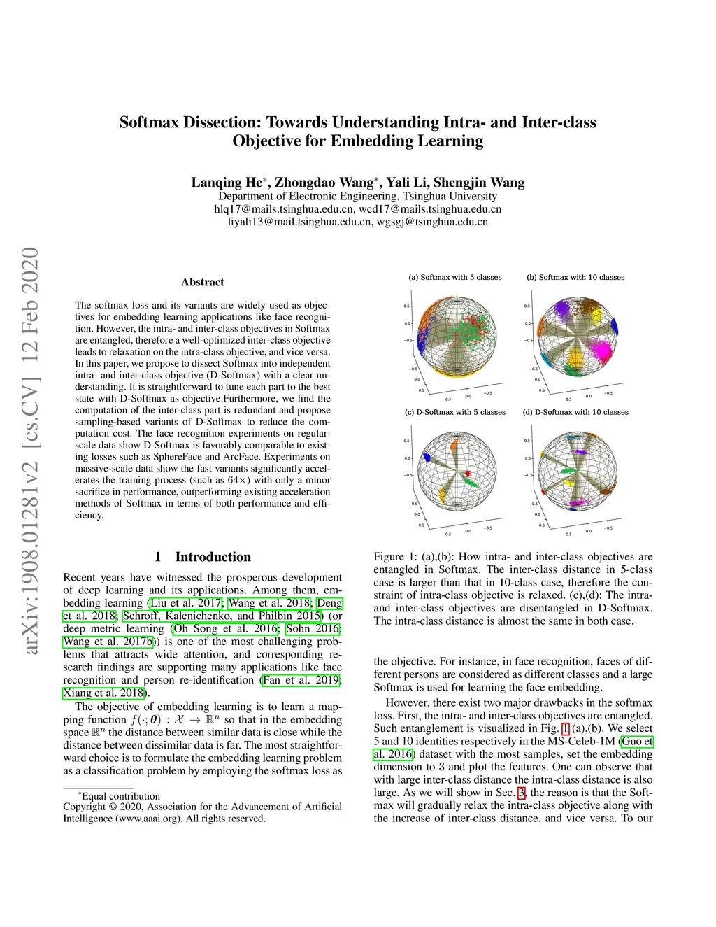 The softmax loss and its variants are widely used as objectives for embedding learning, especially in applications like face recognition. However, the intra- and inter-class objectives in the softmax loss are entangled, therefore a well-optimized inter-class objective leads to relaxation on the intra-class objective, and vice versa. In this paper, we propose to dissect the softmax loss into independent intra- and inter-class objective (D-Softmax). With D-Softmax as objective, we can have a clear understanding of both the intra- and inter-class objective, therefore it is straightforward to tune each part to the best state. Furthermore, we find the computation of the inter-class objective is redundant and propose two sampling-based variants of D-Softmax to reduce the computation cost. Training with regular-scale data, experiments in face verification show D-Softmax is favorably comparable to existing losses such as SphereFace and ArcFace. Training with massive-scale data, experiments show the fast variants of D-Softmax significantly accelerates the training process (such as 64x) with only a minor sacrifice in performance, outperforming existing acceleration methods of softmax in terms of both performance and efficiency.