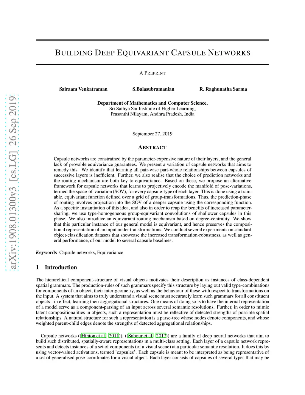 Capsule networks are constrained by the parameter-expensive nature of their layers, and the general lack of provable equivariance guarantees. We present a variation of capsule networks that aims to remedy this. We identify that learning all pair-wise part-whole relationships between capsules of successive layers is inefficient. Further, we also realise that the choice of prediction networks and the routing mechanism are both key to equivariance. Based on these, we propose an alternative framework for capsule networks that learns to projectively encode the manifold of pose-variations, termed the space-of-variation (SOV), for every capsule-type of each layer. This is done using a trainable, equivariant function defined over a grid of group-transformations. Thus, the prediction-phase of routing involves projection into the SOV of a deeper capsule using the corresponding function. As a specific instantiation of this idea, and also in order to reap the benefits of increased parameter-sharing, we use type-homogeneous group-equivariant convolutions of shallower capsules in this phase. We also introduce an equivariant routing mechanism based on degree-centrality. We show that this particular instance of our general model is equivariant, and hence preserves the compositional representation of an input under transformations. We conduct several experiments on standard object-classification datasets that showcase the increased transformation-robustness, as well as general performance, of our model to several capsule baselines.