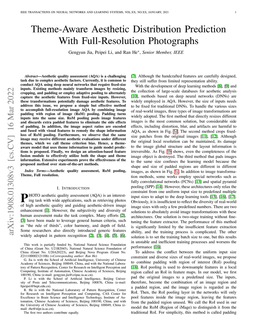 Aesthetic quality assessment (AQA) is a challenging task due to complex aesthetic factors. Currently, it is common to conduct AQA using deep neural networks that require fixed-size inputs. Existing methods mainly transform images by resizing, cropping, and padding or employ adaptive pooling to alternately capture the aesthetic features from fixed-size inputs. However, these transformations potentially damage aesthetic features. To address this issue, we propose a simple but effective method to accomplish full-resolution image AQA by combining image padding with region of image (RoM) pooling. Padding turns inputs into the same size. RoM pooling pools image features and discards extra padded features to eliminate the side effects of padding. In addition, the image aspect ratios are encoded and fused with visual features to remedy the shape information loss of RoM pooling. Furthermore, we observe that the same image may receive different aesthetic evaluations under different themes, which we call theme criterion bias. Hence, a theme-aware model that uses theme information to guide model predictions is proposed. Finally, we design an attention-based feature fusion module to effectively utilize both the shape and theme information. Extensive experiments prove the effectiveness of the proposed method over state-of-the-art methods.