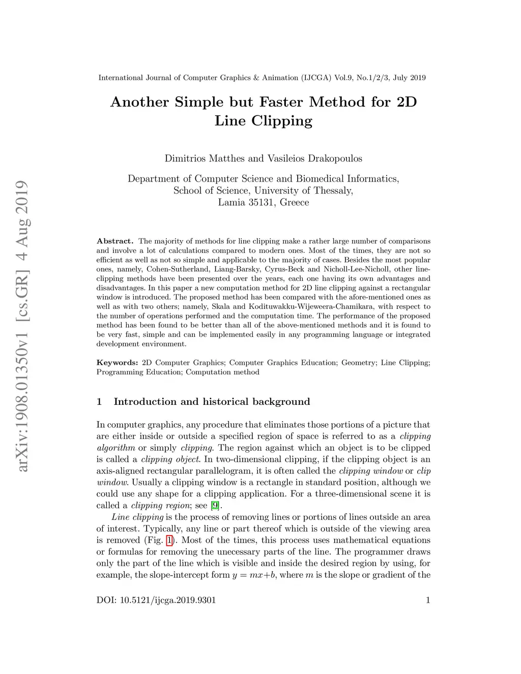 The majority of methods for line clipping make a rather large number of comparisons and involve a lot of calculations compared to modern ones. Most of the times, they are not so efficient as well as not so simple and applicable to the majority of cases. Besides the most popular ones, namely, Cohen-Sutherland, Liang-Barsky, Cyrus-Beck and Nicholl-Lee-Nicholl, other line-clipping methods have been presented over the years, each one having its own advantages and disadvantages. In this paper a new computation method for 2D line clipping against a rectangular window is introduced. The proposed method has been compared with the afore-mentioned ones as well as with two others; namely, Skala and Kodituwakku-Wijeweera-Chamikara, with respect to the number of operations performed and the computation time. The performance of the proposed method has been found to be better than all of the above-mentioned methods and it is found to be very fast, simple and can be implemented easily in any programming language or integrated development environment.