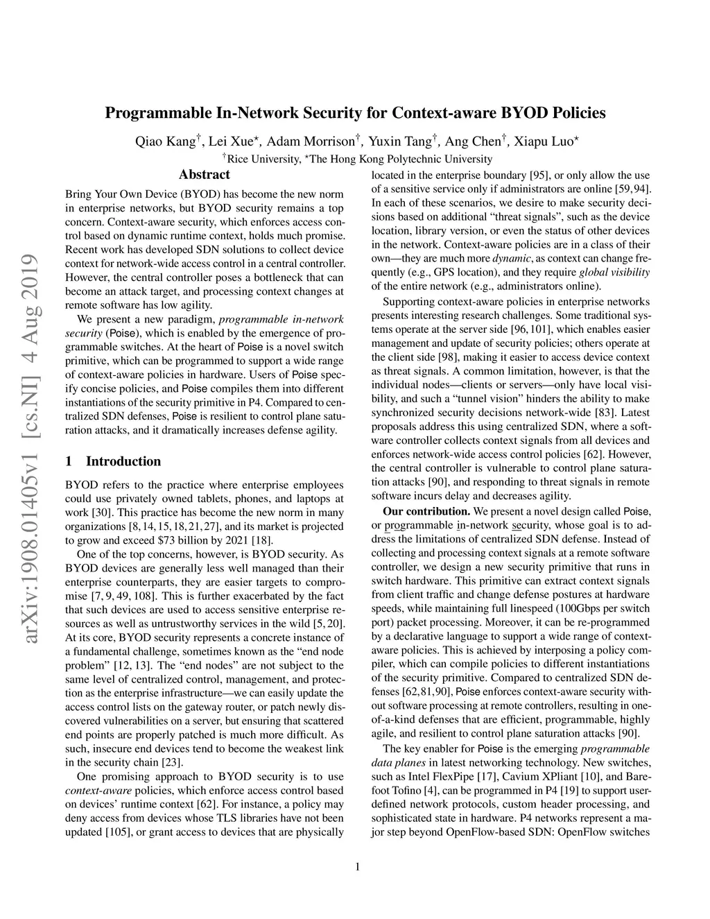 Bring Your Own Device (BYOD) has become the new norm in enterprise networks, but BYOD security remains a top concern. Context-aware security, which enforces access control based on dynamic runtime context, holds much promise. Recent work has developed SDN solutions to collect device context for network-wide access control in a central controller. However, the central controller poses a bottleneck that can become an attack target, and processing context changes at remote software has low agility. We present a new paradigm, programmable in-network security (Poise), which is enabled by the emergence of programmable switches. At the heart of Poise is a novel switch primitive, which can be programmed to support a wide range of context-aware policies in hardware. Users of Poise specify concise policies, and Poise compiles them into different instantiations of the security primitive in P4. Compared to centralized SDN defenses, Poise is resilient to control plane saturation attacks, and it dramatically increases defense agility.