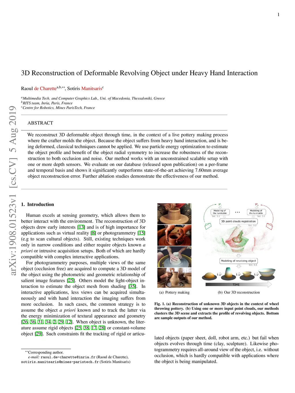 We reconstruct 3D deformable object through time, in the context of a live pottery making process where the crafter molds the object. Because the object suffers from heavy hand interaction, and is being deformed, classical techniques cannot be applied. We use particle energy optimization to estimate the object profile and benefit of the object radial symmetry to increase the robustness of the reconstruction to both occlusion and noise. Our method works with an unconstrained scalable setup with one or more depth sensors. We evaluate on our database (released upon publication) on a per-frame and temporal basis and shows it significantly outperforms state-of-the-art achieving 7.60mm average object reconstruction error. Further ablation studies demonstrate the effectiveness of our method.