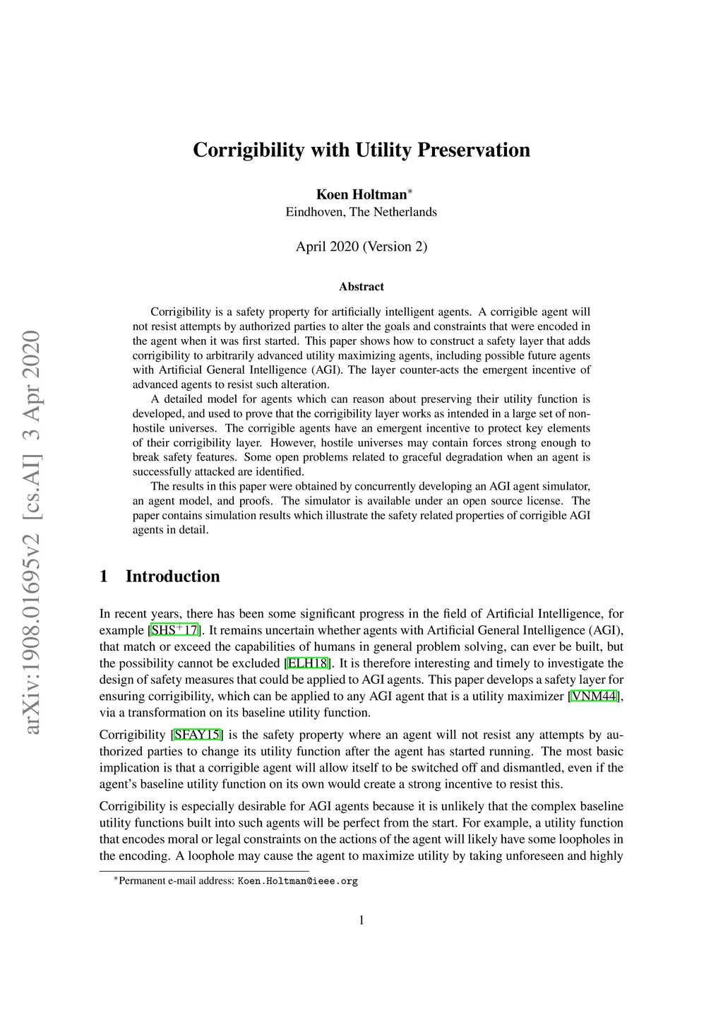 Corrigibility is a safety property for artificially intelligent agents. A corrigible agent will not resist attempts by authorized parties to alter the goals and constraints that were encoded in the agent when it was first started. This paper shows how to construct a safety layer that adds corrigibility to arbitrarily advanced utility maximizing agents, including possible future agents with Artificial General Intelligence (AGI). The layer counter-acts the emergent incentive of advanced agents to resist such alteration. A detailed model for agents which can reason about preserving their utility function is developed, and used to prove that the corrigibility layer works as intended in a large set of non-hostile universes. The corrigible agents have an emergent incentive to protect key elements of their corrigibility layer. However, hostile universes may contain forces strong enough to break safety features. Some open problems related to graceful degradation when an agent is successfully attacked are identified. The results in this paper were obtained by concurrently developing an AGI agent simulator, an agent model, and proofs. The simulator is available under an open source license. The paper contains simulation results which illustrate the safety related properties of corrigible AGI agents in detail.