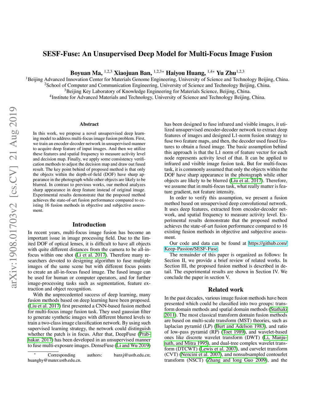SESF-Fuse: An Unsupervised Deep Model for Multi-Focus Image Fusion