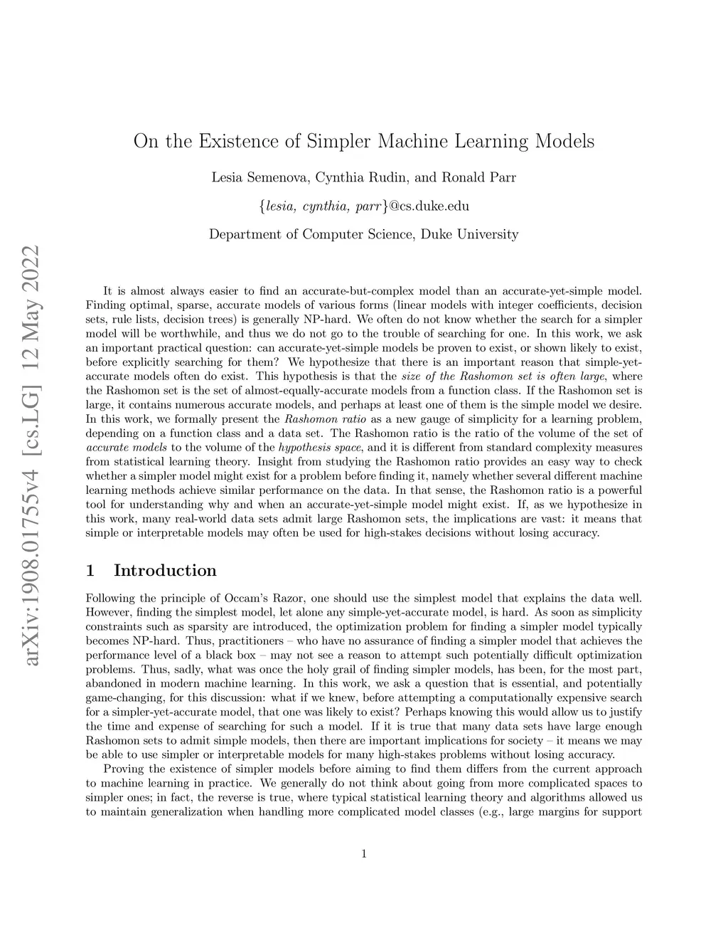 It is almost always easier to find an accurate-but-complex model than an accurate-yet-simple model. Finding optimal, sparse, accurate models of various forms (linear models with integer coefficients, decision sets, rule lists, decision trees) is generally NP-hard. We often do not know whether the search for a simpler model will be worthwhile, and thus we do not go to the trouble of searching for one. In this work, we ask an important practical question: can accurate-yet-simple models be proven to exist, or shown likely to exist, before explicitly searching for them? We hypothesize that there is an important reason that simple-yet-accurate models often do exist. This hypothesis is that the size of the Rashomon set is often large, where the Rashomon set is the set of almost-equally-accurate models from a function class. If the Rashomon set is large, it contains numerous accurate models, and perhaps at least one of them is the simple model we desire. In this work, we formally present the Rashomon ratio as a new gauge of simplicity for a learning problem, depending on a function class and a data set. The Rashomon ratio is the ratio of the volume of the set of accurate models to the volume of the hypothesis space, and it is different from standard complexity measures from statistical learning theory. Insight from studying the Rashomon ratio provides an easy way to check whether a simpler model might exist for a problem before finding it, namely whether several different machine learning methods achieve similar performance on the data. In that sense, the Rashomon ratio is a powerful tool for understanding why and when an accurate-yet-simple model might exist. If, as we hypothesize in this work, many real-world data sets admit large Rashomon sets, the implications are vast: it means that simple or interpretable models may often be used for high-stakes decisions without losing accuracy.