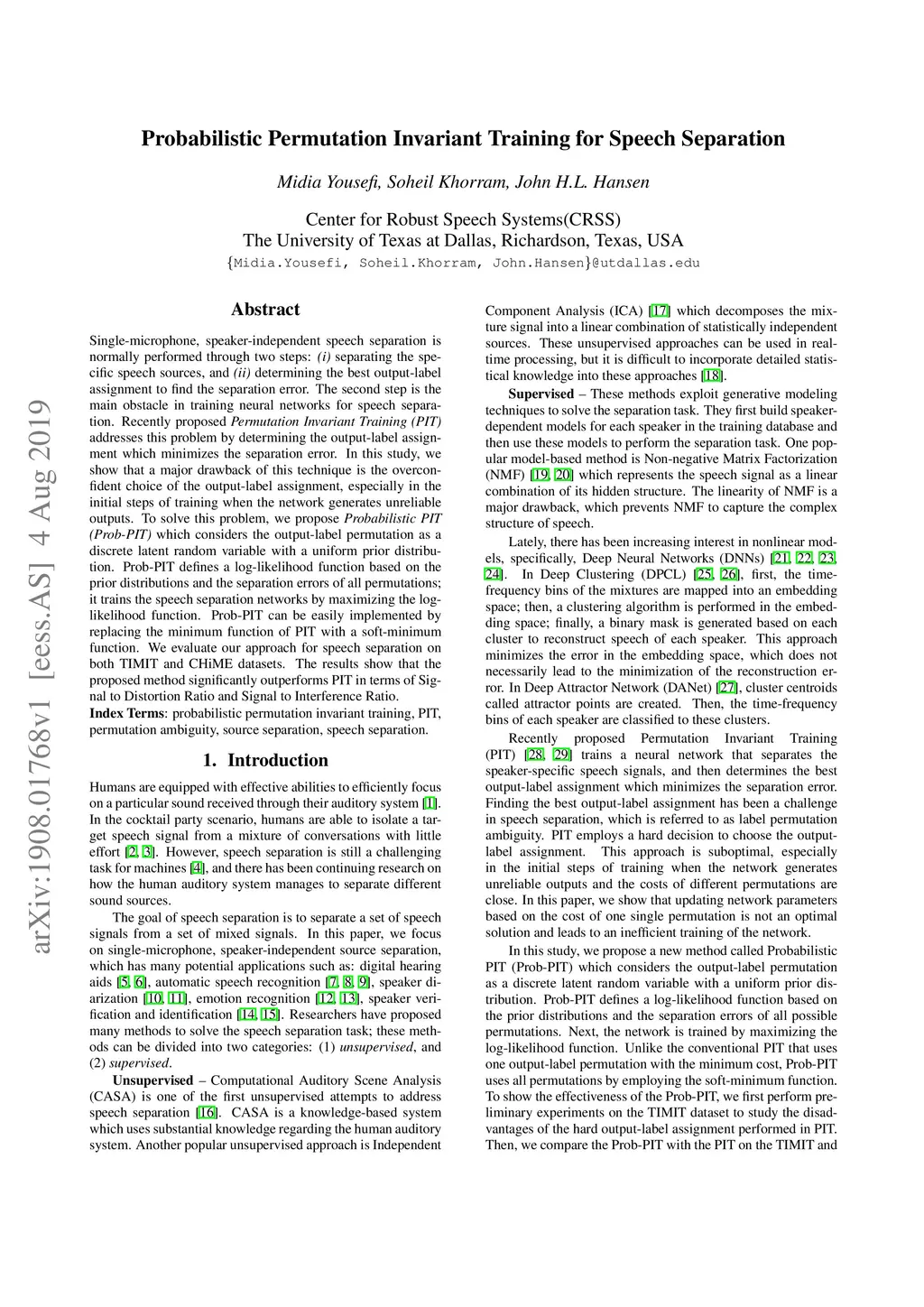 Single-microphone, speaker-independent speech separation is normally performed through two steps: (i) separating the specific speech sources, and (ii) determining the best output-label assignment to find the separation error. The second step is the main obstacle in training neural networks for speech separation. Recently proposed Permutation Invariant Training (PIT) addresses this problem by determining the output-label assignment which minimizes the separation error. In this study, we show that a major drawback of this technique is the overconfident choice of the output-label assignment, especially in the initial steps of training when the network generates unreliable outputs. To solve this problem, we propose Probabilistic PIT (Prob-PIT) which considers the output-label permutation as a discrete latent random variable with a uniform prior distribution. Prob-PIT defines a log-likelihood function based on the prior distributions and the separation errors of all permutations; it trains the speech separation networks by maximizing the log-likelihood function. Prob-PIT can be easily implemented by replacing the minimum function of PIT with a soft-minimum function. We evaluate our approach for speech separation on both TIMIT and CHiME datasets. The results show that the proposed method significantly outperforms PIT in terms of Signal to Distortion Ratio and Signal to Interference Ratio.