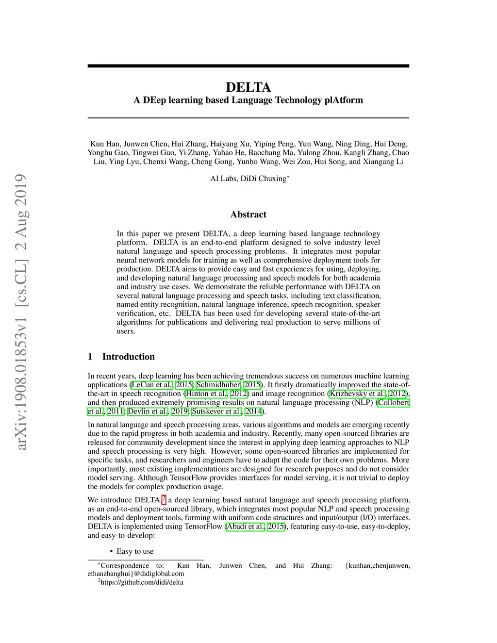 In this paper we present DELTA, a deep learning based language technology platform. DELTA is an end-to-end platform designed to solve industry level natural language and speech processing problems. It integrates most popular neural network models for training as well as comprehensive deployment tools for production. DELTA aims to provide easy and fast experiences for using, deploying, and developing natural language processing and speech models for both academia and industry use cases. We demonstrate the reliable performance with DELTA on several natural language processing and speech tasks, including text classification, named entity recognition, natural language inference, speech recognition, speaker verification, etc. DELTA has been used for developing several state-of-the-art algorithms for publications and delivering real production to serve millions of users.