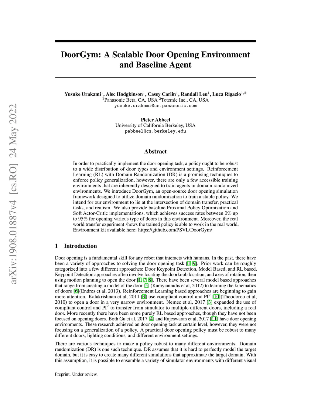 Reinforcement Learning (RL) has brought forth ideas of autonomous robots that can navigate real-world environments with ease, aiding humans in a variety of tasks. RL agents have just begun to make their way out of simulation into the real world. Once in the real world, benchmark tasks often fail to transfer into useful skills. We introduce DoorGym, a simulation environment intended to be the first step to move RL from toy environments towards useful atomic skills that can be composed and extended towards a broader goal. DoorGym is an open-source door simulation framework designed to be highly configurable. We also provide a baseline PPO (Proximal Policy Optimization) and SAC (Soft Actor-Critic)implementation, which achieves a success rate of up to 70% for common tasks in this environment. Environment kit available here:https://github.com/PSVL/DoorGym/