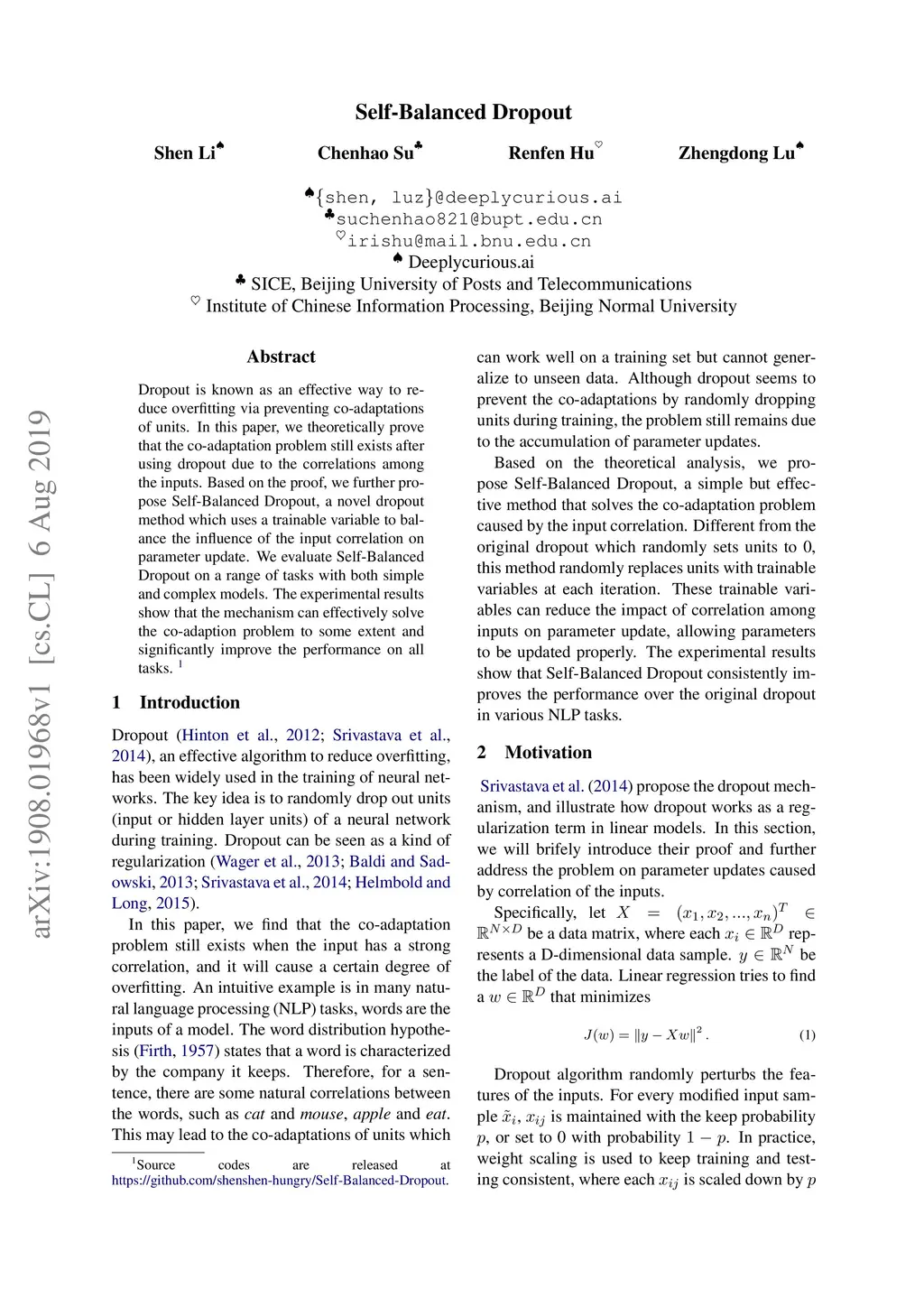 Dropout is known as an effective way to reduce overfitting via preventing co-adaptations of units. In this paper, we theoretically prove that the co-adaptation problem still exists after using dropout due to the correlations among the inputs. Based on the proof, we further propose Self-Balanced Dropout, a novel dropout method which uses a trainable variable to balance the influence of the input correlation on parameter update. We evaluate Self-Balanced Dropout on a range of tasks with both simple and complex models. The experimental results show that the mechanism can effectively solve the co-adaption problem to some extent and significantly improve the performance on all tasks.