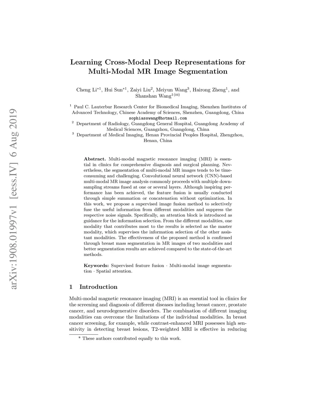Multi-modal magnetic resonance imaging (MRI) is essential in clinics for comprehensive diagnosis and surgical planning. Nevertheless, the segmentation of multi-modal MR images tends to be time-consuming and challenging. Convolutional neural network (CNN)-based multi-modal MR image analysis commonly proceeds with multiple down-sampling streams fused at one or several layers. Although inspiring performance has been achieved, the feature fusion is usually conducted through simple summation or concatenation without optimization. In this work, we propose a supervised image fusion method to selectively fuse the useful information from different modalities and suppress the respective noise signals. Specifically, an attention block is introduced as guidance for the information selection. From the different modalities, one modality that contributes most to the results is selected as the master modality, which supervises the information selection of the other assistant modalities. The effectiveness of the proposed method is confirmed through breast mass segmentation in MR images of two modalities and better segmentation results are achieved compared to the state-of-the-art methods.