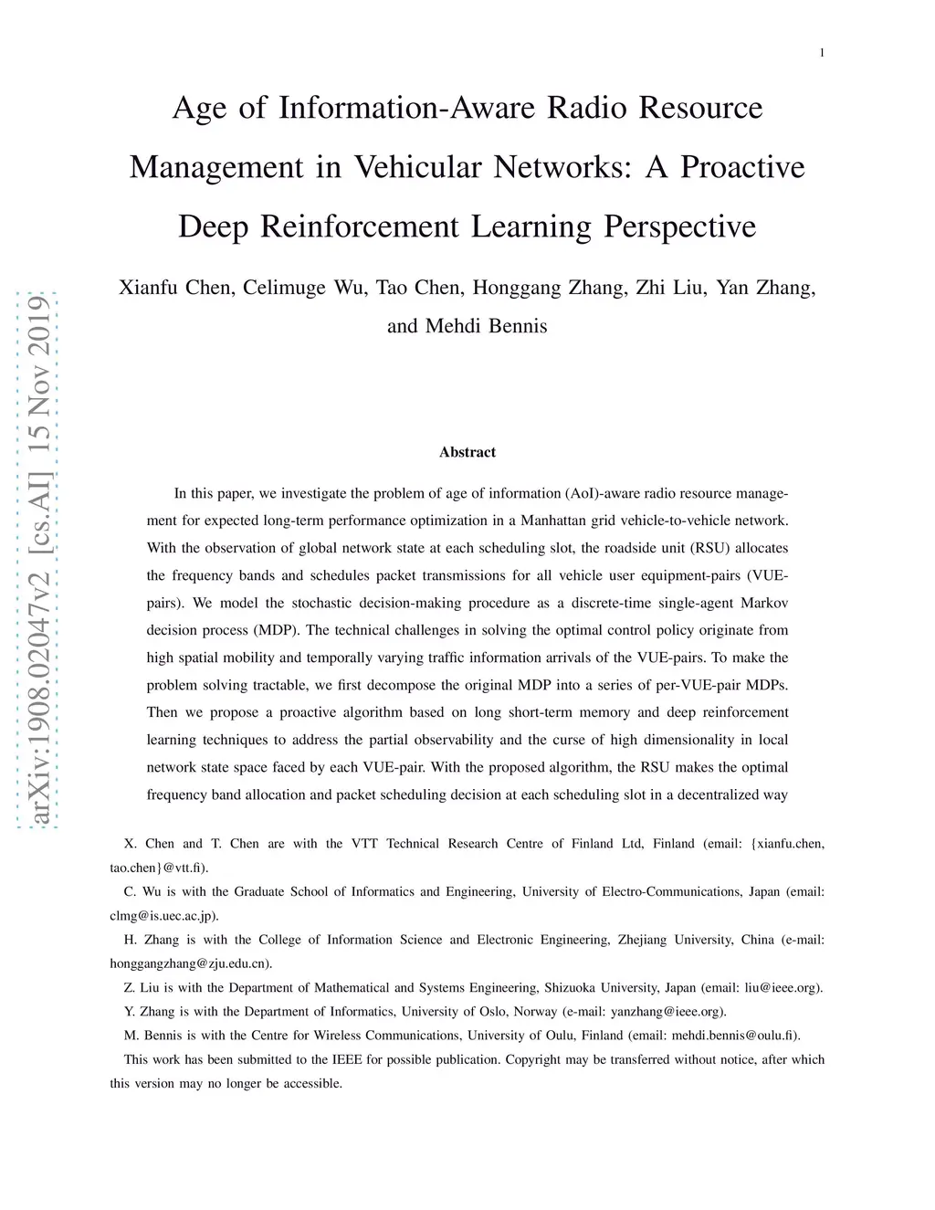 In this paper, we investigate the problem of age of information (AoI)-aware radio resource management for expected long-term performance optimization in a Manhattan grid vehicle-to-vehicle network. With the observation of global network state at each scheduling slot, the roadside unit (RSU) allocates the frequency bands and schedules packet transmissions for all vehicle user equipment-pairs (VUE-pairs). We model the stochastic decision-making procedure as a discrete-time single-agent Markov decision process (MDP). The technical challenges in solving the optimal control policy originate from high spatial mobility and temporally varying traffic information arrivals of the VUE-pairs. To make the problem solving tractable, we first decompose the original MDP into a series of per-VUE-pair MDPs. Then we propose a proactive algorithm based on long short-term memory and deep reinforcement learning techniques to address the partial observability and the curse of high dimensionality in local network state space faced by each VUE-pair. With the proposed algorithm, the RSU makes the optimal frequency band allocation and packet scheduling decision at each scheduling slot in a decentralized way in accordance with the partial observations of the global network state at the VUE-pairs. Numerical experiments validate the theoretical analysis and demonstrate the significant performance improvements from the proposed algorithm.