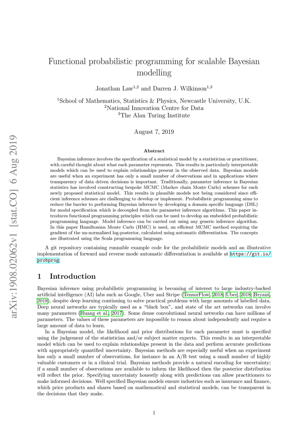 Bayesian inference involves the specification of a statistical model by a statistician or practitioner, with careful thought about what each parameter represents. This results in particularly interpretable models which can be used to explain relationships present in the observed data. Bayesian models are useful when an experiment has only a small number of observations and in applications where transparency of data driven decisions is important. Traditionally, parameter inference in Bayesian statistics has involved constructing bespoke MCMC (Markov chain Monte Carlo) schemes for each newly proposed statistical model. This results in plausible models not being considered since efficient inference schemes are challenging to develop or implement. Probabilistic programming aims to reduce the barrier to performing Bayesian inference by developing a domain specific language (DSL) for model specification which is decoupled from the parameter inference algorithms. This paper introduces functional programming principles which can be used to develop an embedded probabilistic programming language. Model inference can be carried out using any generic inference algorithm. In this paper Hamiltonian Monte Carlo (HMC) is used, an efficient MCMC method requiring the gradient of the un-normalised log-posterior, calculated using automatic differentiation. The concepts are illustrated using the Scala programming language.