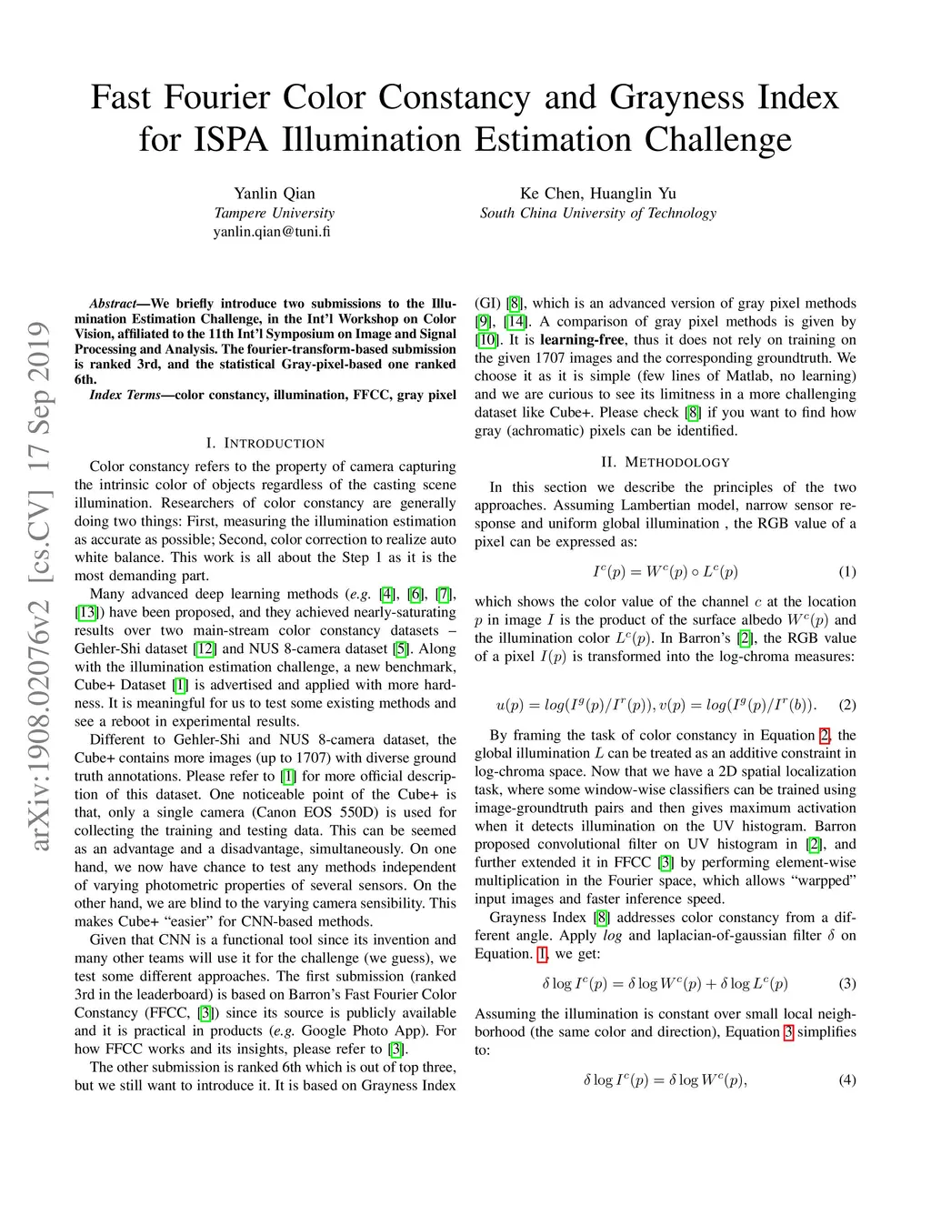 We briefly introduce two submissions to the Illumination Estimation Challenge, in the Int'l Workshop on Color Vision, affiliated to the 11th Int'l Symposium on Image and Signal Processing and Analysis. The Fourier-transform-based submission is ranked 3rd, and the statistical Gray-pixel-based one ranked 6th.