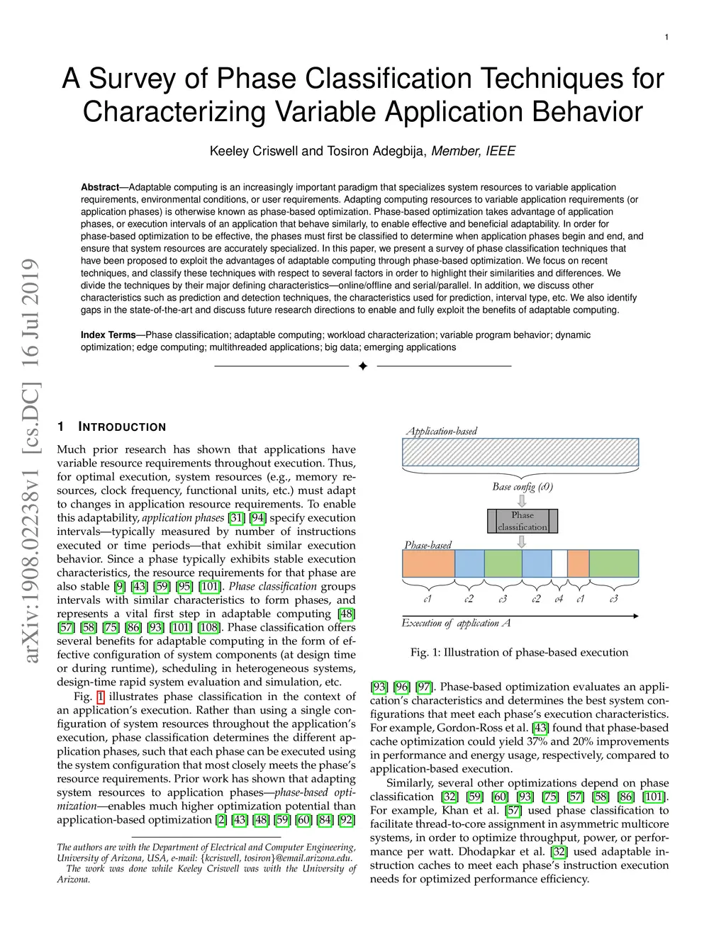 Adaptable computing is an increasingly important paradigm that specializes system resources to variable application requirements, environmental conditions, or user requirements. Adapting computing resources to variable application requirements (or application phases) is otherwise known as phase-based optimization. Phase-based optimization takes advantage of application phases, or execution intervals of an application, that behave similarly, to enable effective and beneficial adaptability. In order for phase-based optimization to be effective, the phases must first be classified to determine when application phases begin and end, and ensure that system resources are accurately specialized. In this paper, we present a survey of phase classification techniques that have been proposed to exploit the advantages of adaptable computing through phase-based optimization. We focus on recent techniques and classify these techniques with respect to several factors in order to highlight their similarities and differences. We divide the techniques by their major defining characteristics---online/offline and serial/parallel. In addition, we discuss other characteristics such as prediction and detection techniques, the characteristics used for prediction, interval type, etc. We also identify gaps in the state-of-the-art and discuss future research directions to enable and fully exploit the benefits of adaptable computing.