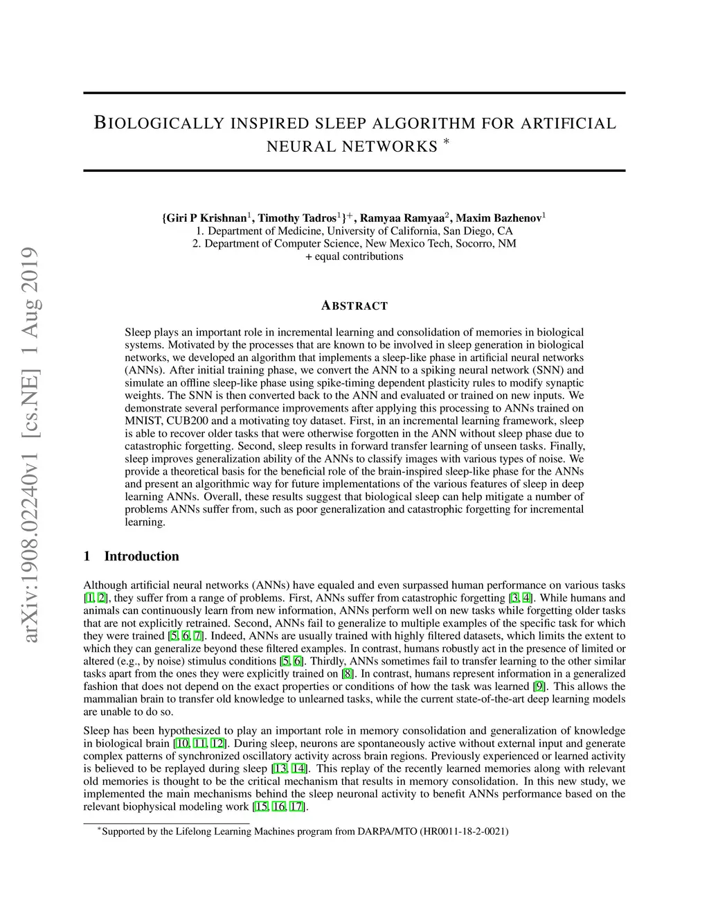 Sleep plays an important role in incremental learning and consolidation of memories in biological systems. Motivated by the processes that are known to be involved in sleep generation in biological networks, we developed an algorithm that implements a sleep-like phase in artificial neural networks (ANNs). After initial training phase, we convert the ANN to a spiking neural network (SNN) and simulate an offline sleep-like phase using spike-timing dependent plasticity rules to modify synaptic weights. The SNN is then converted back to the ANN and evaluated or trained on new inputs. We demonstrate several performance improvements after applying this processing to ANNs trained on MNIST, CUB200 and a motivating toy dataset. First, in an incremental learning framework, sleep is able to recover older tasks that were otherwise forgotten in the ANN without sleep phase due to catastrophic forgetting. Second, sleep results in forward transfer learning of unseen tasks. Finally, sleep improves generalization ability of the ANNs to classify images with various types of noise. We provide a theoretical basis for the beneficial role of the brain-inspired sleep-like phase for the ANNs and present an algorithmic way for future implementations of the various features of sleep in deep learning ANNs. Overall, these results suggest that biological sleep can help mitigate a number of problems ANNs suffer from, such as poor generalization and catastrophic forgetting for incremental learning.