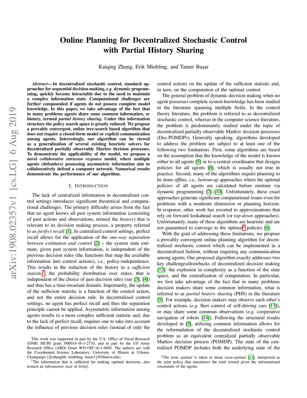 In decentralized stochastic control, standard approaches for sequential decision-making, e.g. dynamic programming, quickly become intractable due to the need to maintain a complex information state. Computational challenges are further compounded if agents do not possess complete model knowledge. In this paper, we take advantage of the fact that in many problems agents share some common information, or history, termed partial history sharing. Under this information structure the policy search space is greatly reduced. We propose a provably convergent, online tree-search based algorithm that does not require a closed-form model or explicit communication among agents. Interestingly, our algorithm can be viewed as a generalization of several existing heuristic solvers for decentralized partially observable Markov decision processes. To demonstrate the applicability of the model, we propose a novel collaborative intrusion response model, where multiple agents (defenders) possessing asymmetric information aim to collaboratively defend a computer network. Numerical results demonstrate the performance of our algorithm.