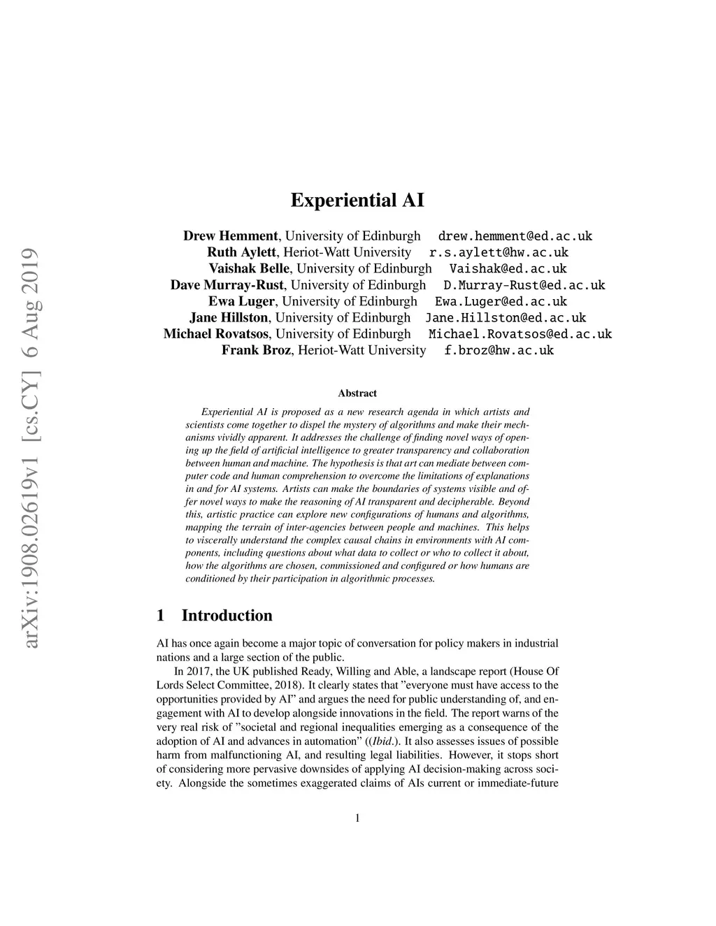 Experiential AI is proposed as a new research agenda in which artists and scientists come together to dispel the mystery of algorithms and make their mechanisms vividly apparent. It addresses the challenge of finding novel ways of opening up the field of artificial intelligence to greater transparency and collaboration between human and machine. The hypothesis is that art can mediate between computer code and human comprehension to overcome the limitations of explanations in and for AI systems. Artists can make the boundaries of systems visible and offer novel ways to make the reasoning of AI transparent and decipherable. Beyond this, artistic practice can explore new configurations of humans and algorithms, mapping the terrain of inter-agencies between people and machines. This helps to viscerally understand the complex causal chains in environments with AI components, including questions about what data to collect or who to collect it about, how the algorithms are chosen, commissioned and configured or how humans are conditioned by their participation in algorithmic processes.