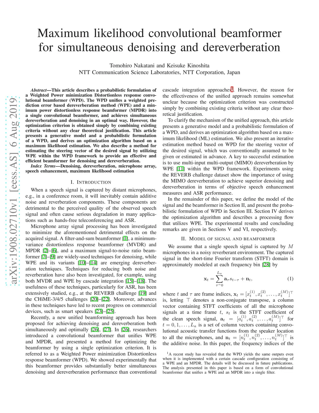 Maximum likelihood convolutional beamformer for simultaneous denoising
