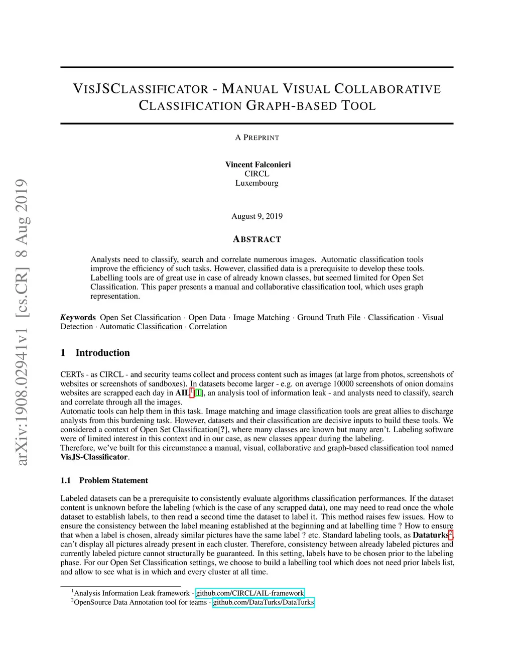 Analysts need to classify, search and correlate numerous images. Automatic classification tools improve the efficiency of such tasks. However, classified data is a prerequisite to develop these tools. Labelling tools are of great use in case of already known classes, but seemed limited for Open Set Classification. This paper presents a manual and collaborative classification tool, which uses graph representation.