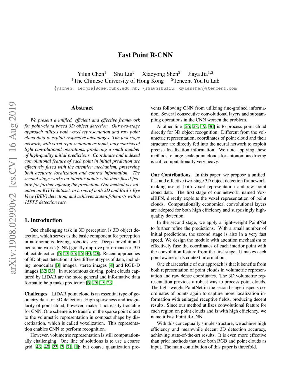 We present a unified, efficient and effective framework for point-cloud based 3D object detection. Our two-stage approach utilizes both voxel representation and raw point cloud data to exploit respective advantages. The first stage network, with voxel representation as input, only consists of light convolutional operations, producing a small number of high-quality initial predictions. Coordinate and indexed convolutional feature of each point in initial prediction are effectively fused with the attention mechanism, preserving both accurate localization and context information. The second stage works on interior points with their fused feature for further refining the prediction. Our method is evaluated on KITTI dataset, in terms of both 3D and Bird's Eye View (BEV) detection, and achieves state-of-the-arts with a 15FPS detection rate.