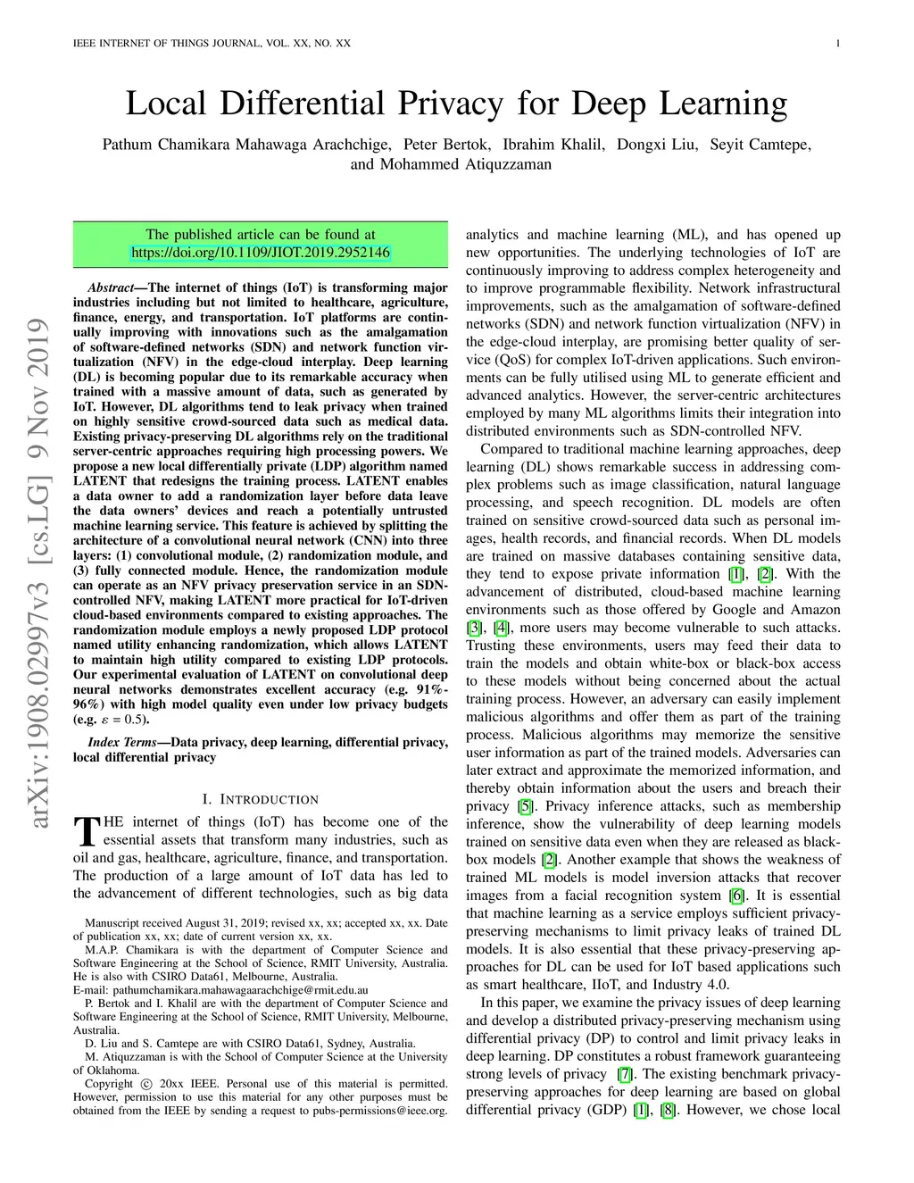 The internet of things (IoT) is transforming major industries including but not limited to healthcare, agriculture, finance, energy, and transportation. IoT platforms are continually improving with innovations such as the amalgamation of software-defined networks (SDN) and network function virtualization (NFV) in the edge-cloud interplay. Deep learning (DL) is becoming popular due to its remarkable accuracy when trained with a massive amount of data, such as generated by IoT. However, DL algorithms tend to leak privacy when trained on highly sensitive crowd-sourced data such as medical data. Existing privacy-preserving DL algorithms rely on the traditional server-centric approaches requiring high processing powers. We propose a new local differentially private (LDP) algorithm named LATENT that redesigns the training process. LATENT enables a data owner to add a randomization layer before data leave the data owners' devices and reach a potentially untrusted machine learning service. This feature is achieved by splitting the architecture of a convolutional neural network (CNN) into three layers: (1) convolutional module, (2) randomization module, and (3) fully connected module. Hence, the randomization module can operate as an NFV privacy preservation service in an SDN-controlled NFV, making LATENT more practical for IoT-driven cloud-based environments compared to existing approaches. The randomization module employs a newly proposed LDP protocol named utility enhancing randomization, which allows LATENT to maintain high utility compared to existing LDP protocols. Our experimental evaluation of LATENT on convolutional deep neural networks demonstrates excellent accuracy (e.g. 91%- 96%) with high model quality even under low privacy budgets (e.g. ).