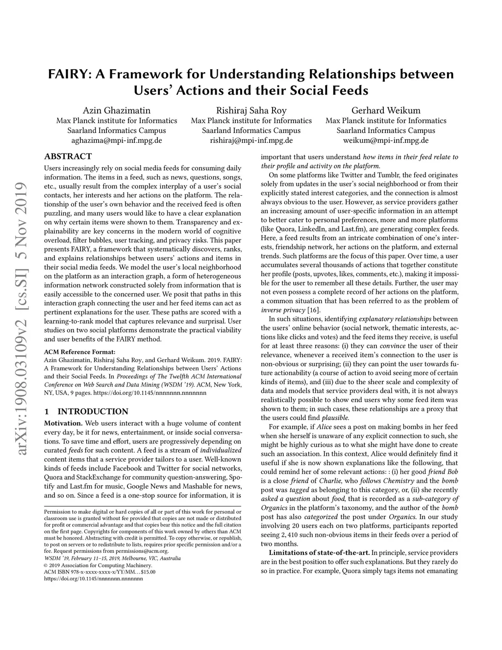 Users increasingly rely on social media feeds for consuming daily information. The items in a feed, such as news, questions, songs, etc., usually result from the complex interplay of a user's social contacts, her interests and her actions on the platform. The relationship of the user's own behavior and the received feed is often puzzling, and many users would like to have a clear explanation on why certain items were shown to them. Transparency and explainability are key concerns in the modern world of cognitive overload, filter bubbles, user tracking, and privacy risks. This paper presents FAIRY, a framework that systematically discovers, ranks, and explains relationships between users' actions and items in their social media feeds. We model the user's local neighborhood on the platform as an interaction graph, a form of heterogeneous information network constructed solely from information that is easily accessible to the concerned user. We posit that paths in this interaction graph connecting the user and her feed items can act as pertinent explanations for the user. These paths are scored with a learning-to-rank model that captures relevance and surprisal. User studies on two social platforms demonstrate the practical viability and user benefits of the FAIRY method.