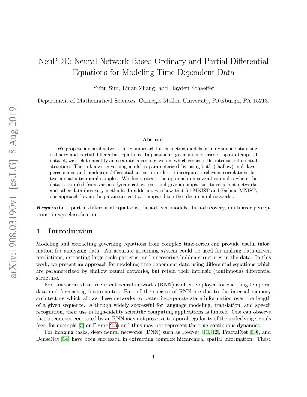 We propose a neural network based approach for extracting models from dynamic data using ordinary and partial differential equations. In particular, given a time-series or spatio-temporal dataset, we seek to identify an accurate governing system which respects the intrinsic differential structure. The unknown governing model is parameterized by using both (shallow) multilayer perceptrons and nonlinear differential terms, in order to incorporate relevant correlations between spatio-temporal samples. We demonstrate the approach on several examples where the data is sampled from various dynamical systems and give a comparison to recurrent networks and other data-discovery methods. In addition, we show that for MNIST and Fashion MNIST, our approach lowers the parameter cost as compared to other deep neural networks.