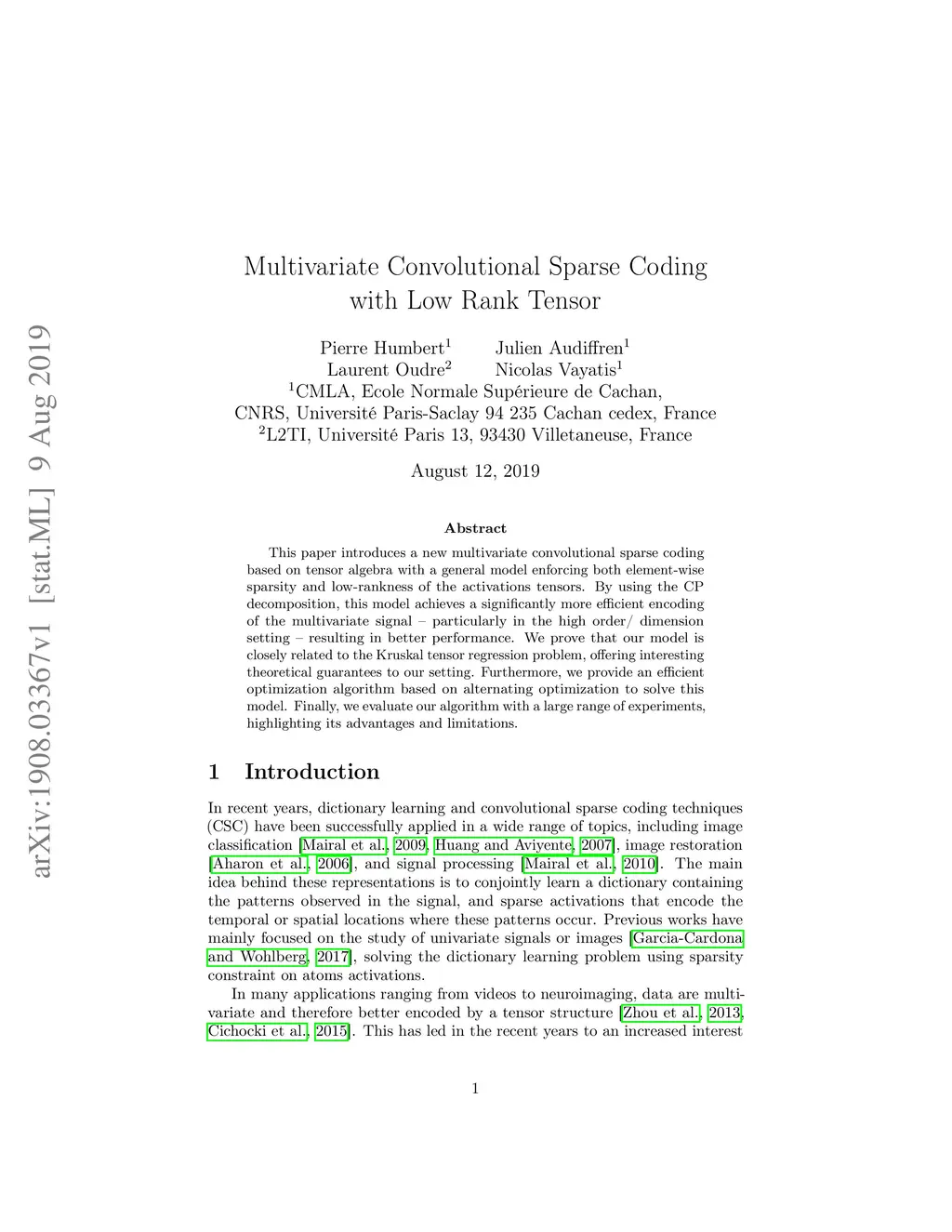 This paper introduces a new multivariate convolutional sparse coding based on tensor algebra with a general model enforcing both element-wise sparsity and low-rankness of the activations tensors. By using the CP decomposition, this model achieves a significantly more efficient encoding of the multivariate signal-particularly in the high order/ dimension setting-resulting in better performance. We prove that our model is closely related to the Kruskal tensor regression problem, offering interesting theoretical guarantees to our setting. Furthermore, we provide an efficient optimization algorithm based on alternating optimization to solve this model. Finally, we evaluate our algorithm with a large range of experiments, highlighting its advantages and limitations.
