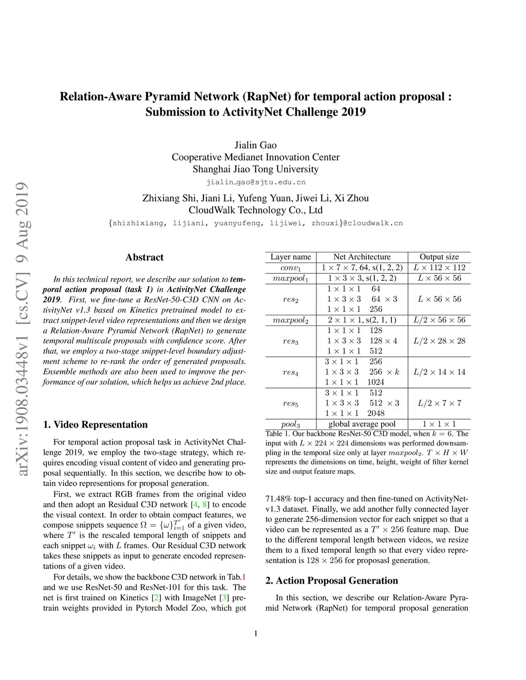 In this technical report, we describe our solution to temporal action proposal (task 1) in ActivityNet Challenge 2019. First, we fine-tune a ResNet-50-C3D CNN on ActivityNet v1.3 based on Kinetics pretrained model to extract snippet-level video representations and then we design a Relation-Aware Pyramid Network (RapNet) to generate temporal multiscale proposals with confidence score. After that, we employ a two-stage snippet-level boundary adjustment scheme to re-rank the order of generated proposals. Ensemble methods are also been used to improve the performance of our solution, which helps us achieve 2nd place.