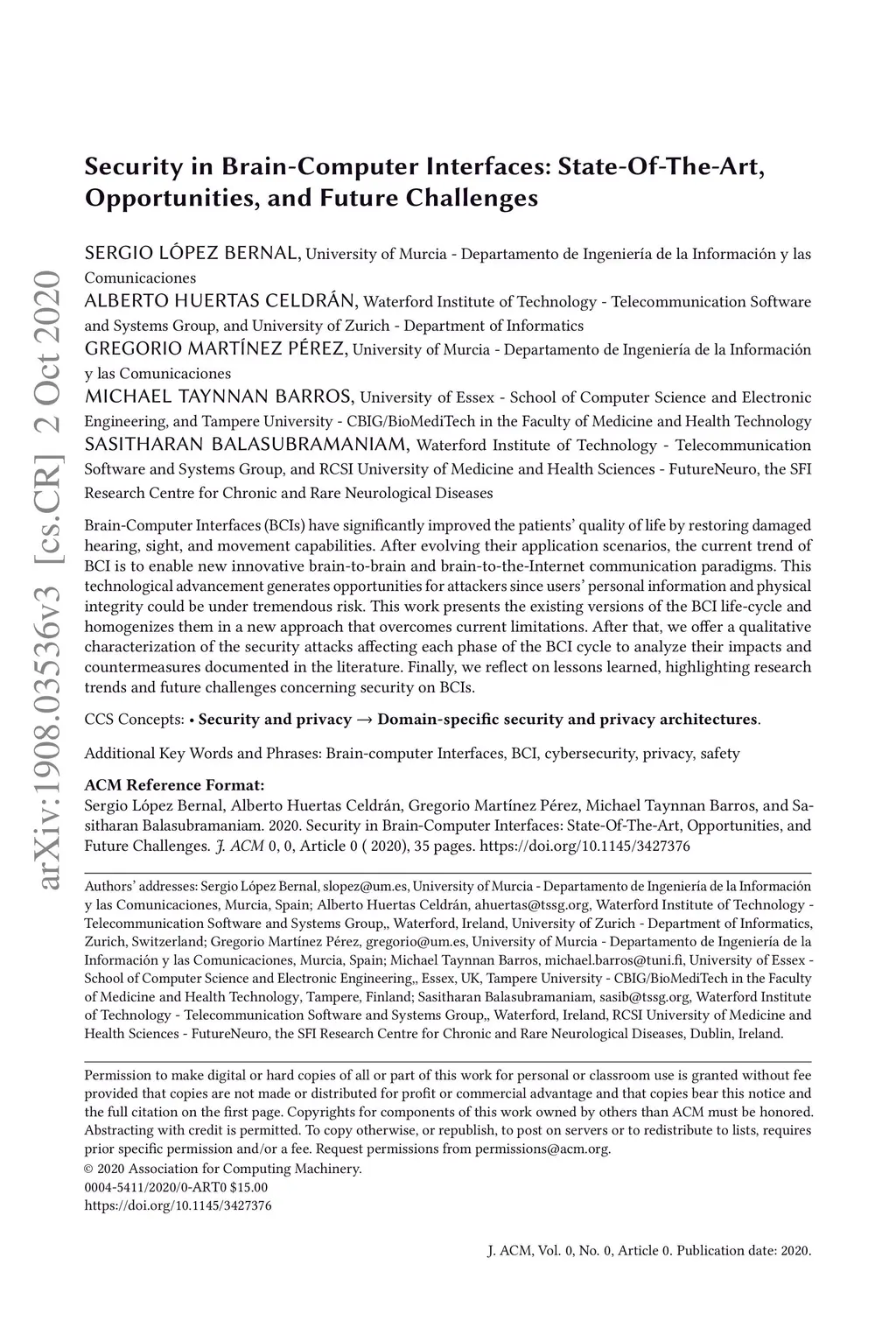 Cybersecurity in Brain-Computer Interfaces: State-of-the-art,