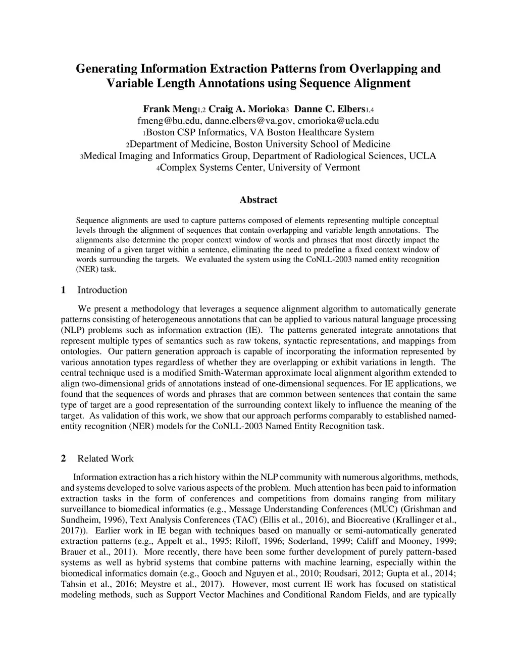 Sequence alignments are used to capture patterns composed of elements representing multiple conceptual levels through the alignment of sequences that contain overlapping and variable length annotations. The alignments also determine the proper context window of words and phrases that most directly impact the meaning of a given target within a sentence, eliminating the need to predefine a fixed context window of words surrounding the targets. We evaluated the system using the CoNLL-2003 named entity recognition (NER) task.