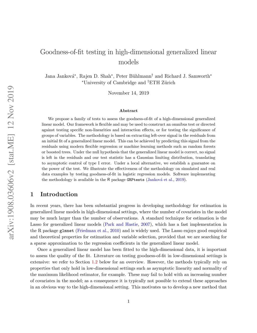 We propose a family of tests to assess the goodness-of-fit of a high-dimensional generalized linear model. Our framework is flexible and may be used to construct an omnibus test or directed against testing specific non-linearities and interaction effects, or for testing the significance of groups of variables. The methodology is based on extracting left-over signal in the residuals from an initial fit of a generalized linear model. This can be achieved by predicting this signal from the residuals using modern flexible regression or machine learning methods such as random forests or boosted trees. Under the null hypothesis that the generalized linear model is correct, no signal is left in the residuals and our test statistic has a Gaussian limiting distribution, translating to asymptotic control of type I error. Under a local alternative, we establish a guarantee on the power of the test. We illustrate the effectiveness of the methodology on simulated and real data examples by testing goodness-of-fit in logistic regression models. Software implementing the methodology is available in the R package `GRPtests'.