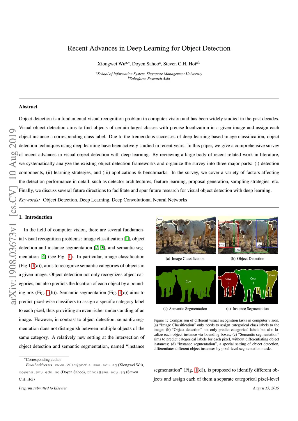 Object detection is a fundamental visual recognition problem in computer vision and has been widely studied in the past decades. Visual object detection aims to find objects of certain target classes with precise localization in a given image and assign each object instance a corresponding class label. Due to the tremendous successes of deep learning based image classification, object detection techniques using deep learning have been actively studied in recent years. In this paper, we give a comprehensive survey of recent advances in visual object detection with deep learning. By reviewing a large body of recent related work in literature, we systematically analyze the existing object detection frameworks and organize the survey into three major parts: (i) detection components, (ii) learning strategies, and (iii) applications & benchmarks. In the survey, we cover a variety of factors affecting the detection performance in detail, such as detector architectures, feature learning, proposal generation, sampling strategies, etc. Finally, we discuss several future directions to facilitate and spur future research for visual object detection with deep learning. Keywords: Object Detection, Deep Learning, Deep Convolutional Neural Networks