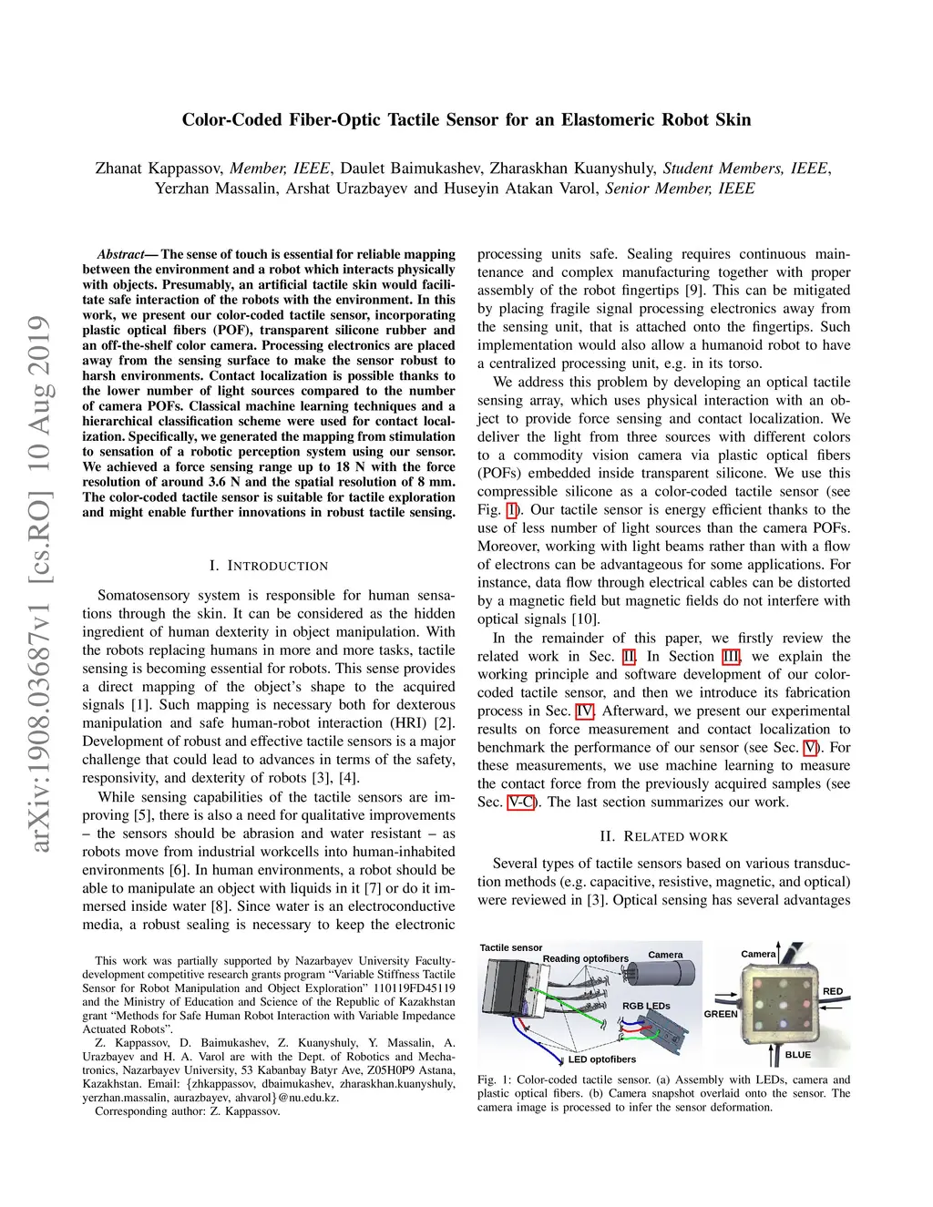 Color-Coded Fiber-Optic Tactile Sensor for an Elastomeric Robot Skin