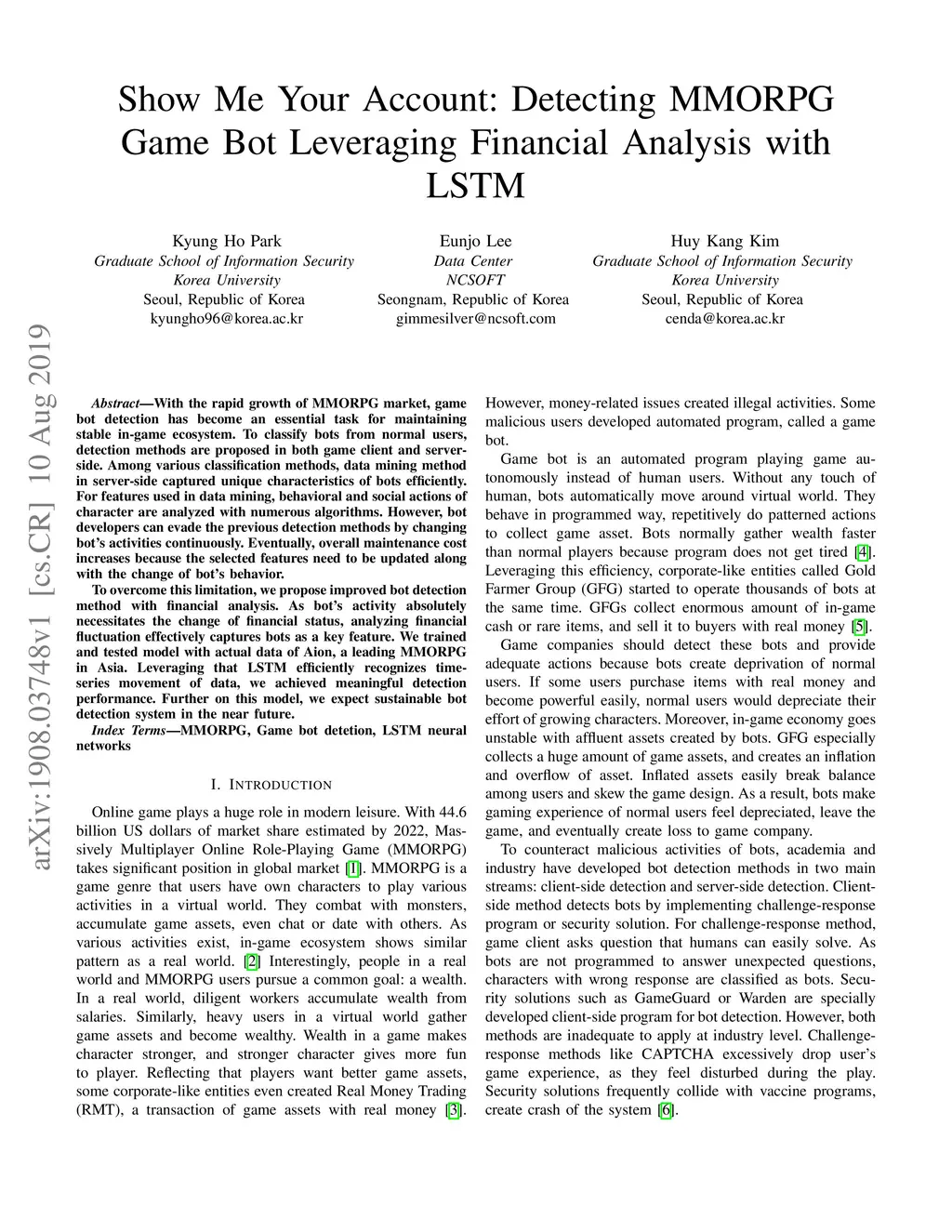 With the rapid growth of MMORPG market, game bot detection has become an essential task for maintaining stable in-game ecosystem. To classify bots from normal users, detection methods are proposed in both game client and server-side. Among various classification methods, data mining method in server-side captured unique characteristics of bots efficiently. For features used in data mining, behavioral and social actions of character are analyzed with numerous algorithms. However, bot developers can evade the previous detection methods by changing bot's activities continuously. Eventually, overall maintenance cost increases because the selected features need to be updated along with the change of bot's behavior. To overcome this limitation, we propose improved bot detection method with financial analysis. As bot's activity absolutely necessitates the change of financial status, analyzing financial fluctuation effectively captures bots as a key feature. We trained and tested model with actual data of Aion, a leading MMORPG in Asia. Leveraging that LSTM efficiently recognizes time-series movement of data, we achieved meaningful detection performance. Further on this model, we expect sustainable bot detection system in the near future.