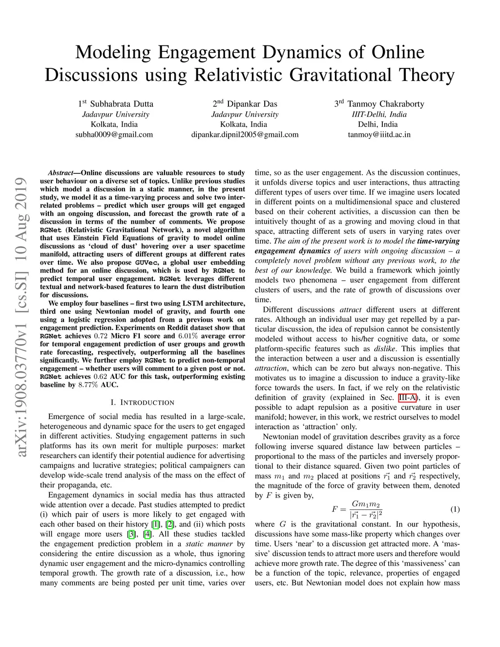 Online discussions are valuable resources to study user behaviour on a diverse set of topics. Unlike previous studies which model a discussion in a static manner, in the present study, we model it as a time-varying process and solve two inter-related problems -- predict which user groups will get engaged with an ongoing discussion, and forecast the growth rate of a discussion in terms of the number of comments. We propose RGNet (Relativistic Gravitational Nerwork), a novel algorithm that uses Einstein Field Equations of gravity to model online discussions as `cloud of dust' hovering over a user spacetime manifold, attracting users of different groups at different rates over time. We also propose GUVec, a global user embedding method for an online discussion, which is used by RGNet to predict temporal user engagement. RGNet leverages different textual and network-based features to learn the dust distribution for discussions. We employ four baselines -- first two using LSTM architecture, third one using Newtonian model of gravity, and fourth one using a logistic regression adopted from a previous work on engagement prediction. Experiments on Reddit dataset show that RGNet achieves 0.72 Micro F1 score and 6.01% average error for temporal engagement prediction of user groups and growth rate forecasting, respectively, outperforming all the baselines significantly. We further employ RGNet to predict non-temporal engagement -- whether users will comment to a given post or not. RGNet achieves 0.62 AUC for this task, outperforming existing baseline by 8.77% AUC.