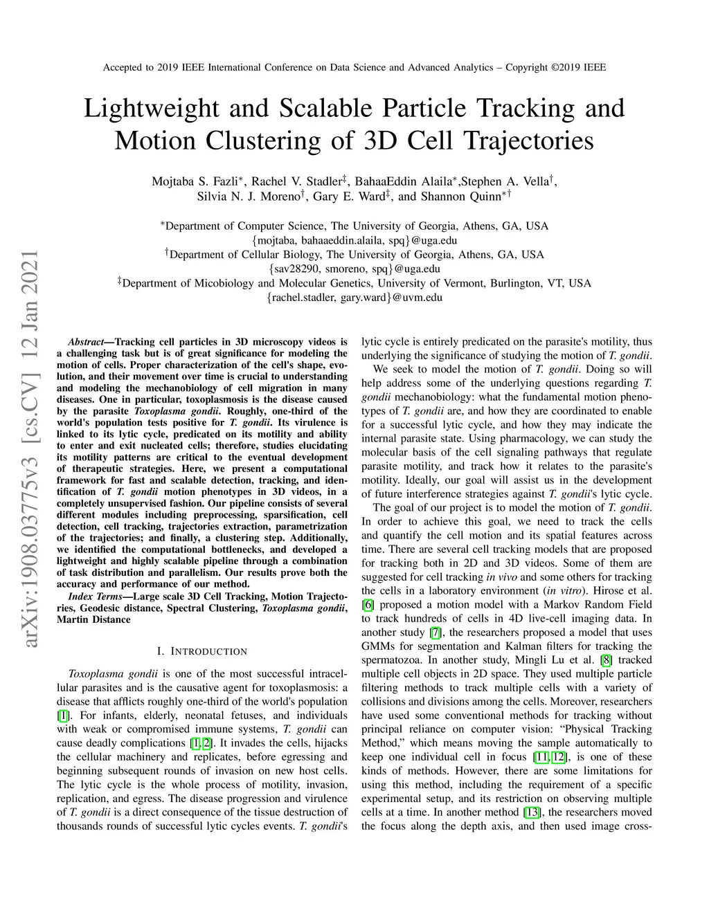 Tracking cell particles in 3D microscopy videos is a challenging task but is of great significance for modeling the motion of cells. Proper characterization of the cell's shape, evolution, and their movement over time is crucial to understanding and modeling the mechanobiology of cell migration in many diseases. One in particular, toxoplasmosis is the disease caused by the parasite Toxoplasma gondii. Roughly, one-third of the world's population tests positive for T. gondii. Its virulence is linked to its lytic cycle, predicated on its motility and ability to enter and exit nucleated cells; therefore, studies elucidating its motility patterns are critical to the eventual development of therapeutic strategies. Here, we present a computational framework for fast and scalable detection, tracking, and identification of T. gondii motion phenotypes in 3D videos, in a completely unsupervised fashion. Our pipeline consists of several different modules including preprocessing, sparsification, cell detection, cell tracking, trajectories extraction, parametrization of the trajectories; and finally, a clustering step. Additionally, we identified the computational bottlenecks, and developed a lightweight and highly scalable pipeline through a combination of task distribution and parallelism. Our results prove both the accuracy and performance of our method.