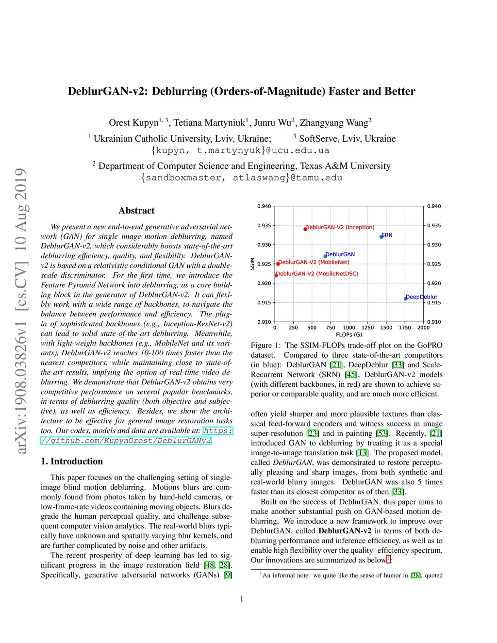 DeblurGAN-v2: Deblurring (Orders-of-Magnitude) Faster and Better