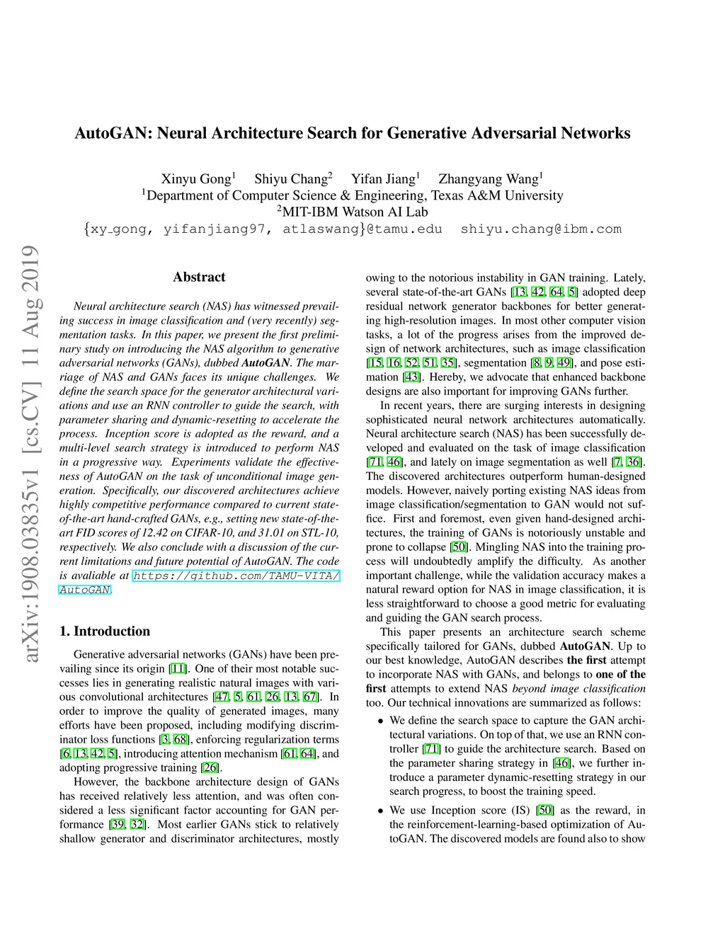 AutoGAN: Neural Architecture Search for Generative Adversarial Networks