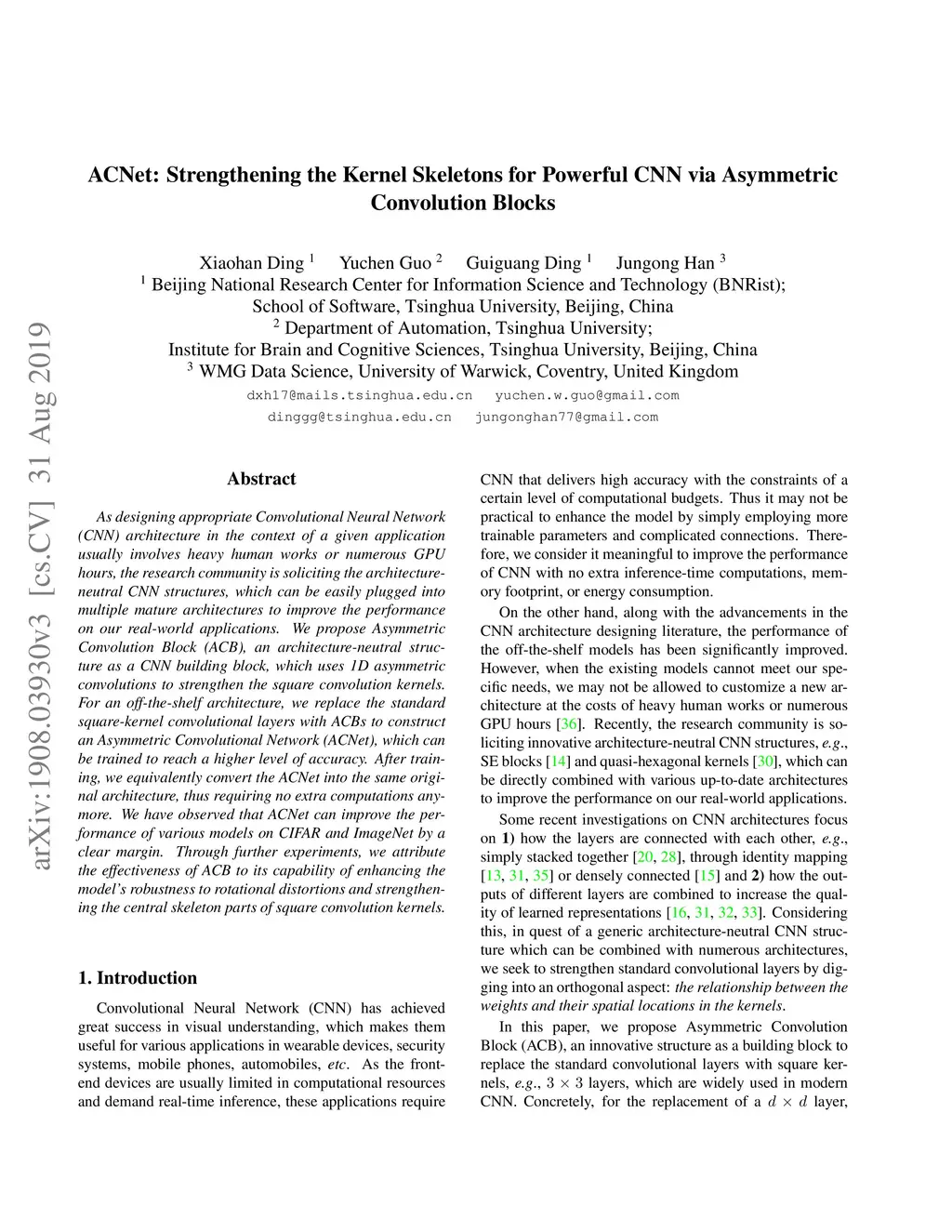 As designing appropriate Convolutional Neural Network (CNN) architecture in the context of a given application usually involves heavy human works or numerous GPU hours, the research community is soliciting the architecture-neutral CNN structures, which can be easily plugged into multiple mature architectures to improve the performance on our real-world applications. We propose Asymmetric Convolution Block (ACB), an architecture-neutral structure as a CNN building block, which uses 1D asymmetric convolutions to strengthen the square convolution kernels. For an off-the-shelf architecture, we replace the standard square-kernel convolutional layers with ACBs to construct an Asymmetric Convolutional Network (ACNet), which can be trained to reach a higher level of accuracy. After training, we equivalently convert the ACNet into the same original architecture, thus requiring no extra computations anymore. We have observed that ACNet can improve the performance of various models on CIFAR and ImageNet by a clear margin. Through further experiments, we attribute the effectiveness of ACB to its capability of enhancing the model's robustness to rotational distortions and strengthening the central skeleton parts of square convolution kernels.