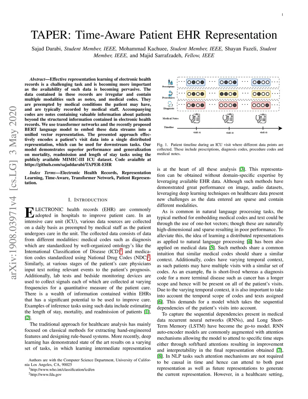 Effective representation learning of electronic health records is a challenging task and is becoming more important as the availability of such data is becoming pervasive. The data contained in these records are irregular and contain multiple modalities such as notes, and medical codes. They are preempted by medical conditions the patient may have, and are typically jotted down by medical staff. Accompanying codes are notes containing valuable information about patients beyond the structured information contained in electronic health records. We use transformer networks and the recently proposed BERT language model to embed these data streams into a unified vector representation. The presented approach effectively encodes a patient's visit data into a single distributed representation, which can be used for downstream tasks. Our model demonstrates superior performance and generalization on mortality, readmission and length of stay tasks using the publicly available MIMIC-III ICU dataset. Code avaialble at https://github.com/sajaddarabi/TAPER-EHR