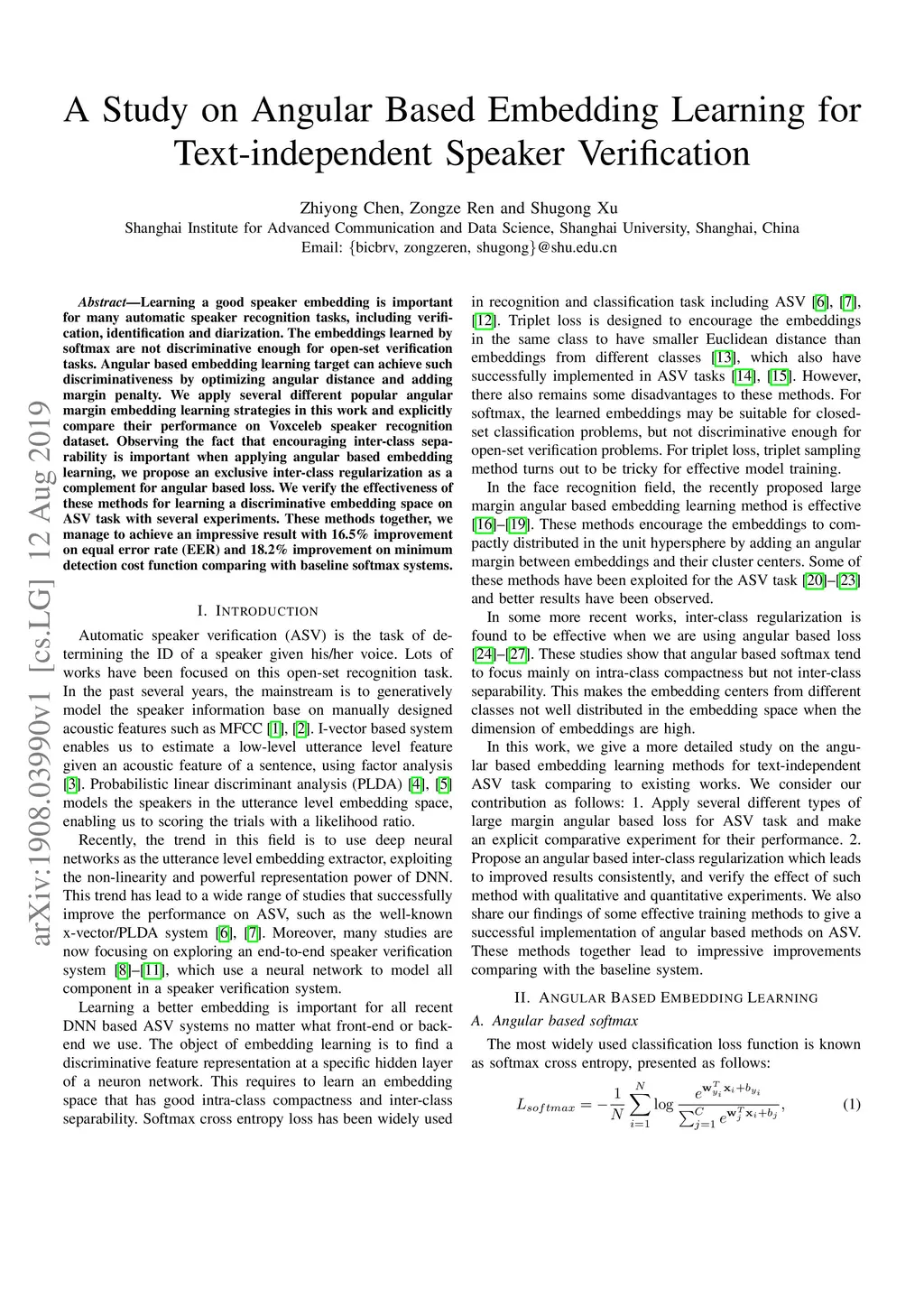 Learning a good speaker embedding is important for many automatic speaker recognition tasks, including verification, identification and diarization. The embeddings learned by softmax are not discriminative enough for open-set verification tasks. Angular based embedding learning target can achieve such discriminativeness by optimizing angular distance and adding margin penalty. We apply several different popular angular margin embedding learning strategies in this work and explicitly compare their performance on Voxceleb speaker recognition dataset. Observing the fact that encouraging inter-class separability is important when applying angular based embedding learning, we propose an exclusive inter-class regularization as a complement for angular based loss. We verify the effectiveness of these methods for learning a discriminative embedding space on ASV task with several experiments. These methods together, we manage to achieve an impressive result with 16.5% improvement on equal error rate (EER) and 18.2% improvement on minimum detection cost function comparing with baseline softmax systems.