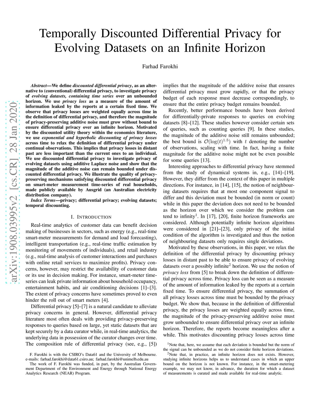 We define discounted differential privacy, as an alternative to (conventional) differential privacy, to investigate privacy of evolving datasets, containing time series over an unbounded horizon. We use privacy loss as a measure of the amount of information leaked by the reports at a certain fixed time. We observe that privacy losses are weighted equally across time in the definition of differential privacy, and therefore the magnitude of privacy-preserving additive noise must grow without bound to ensure differential privacy over an infinite horizon. Motivated by the discounted utility theory within the economics literature, we use exponential and hyperbolic discounting of privacy losses across time to relax the definition of differential privacy under continual observations. This implies that privacy losses in distant past are less important than the current ones to an individual. We use discounted differential privacy to investigate privacy of evolving datasets using additive Laplace noise and show that the magnitude of the additive noise can remain bounded under discounted differential privacy. We illustrate the quality of privacy-preserving mechanisms satisfying discounted differential privacy on smart-meter measurement time-series of real households, made publicly available by Ausgrid (an Australian electricity distribution company).