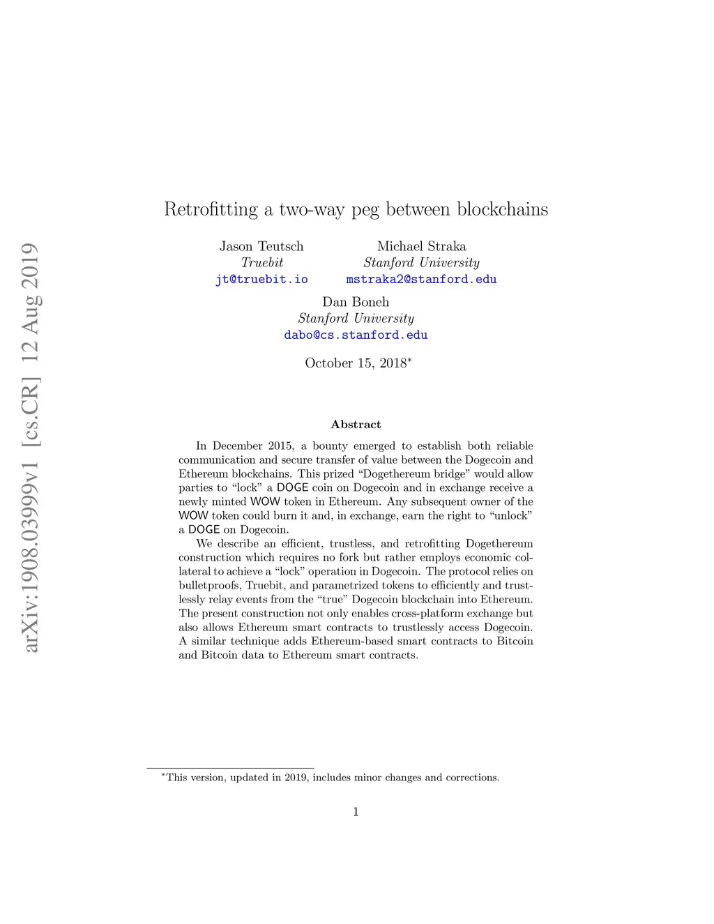 In December 2015, a bounty emerged to establish both reliable communication and secure transfer of value between the Dogecoin and Ethereum blockchains. This prized "Dogethereum bridge" would allow parties to "lock" a DOGE coin on Dogecoin and in exchange receive a newly minted WOW token in Ethereum. Any subsequent owner of the WOW token could burn it and, in exchange, earn the right to "unlock" a DOGE on Dogecoin. We describe an efficient, trustless, and retrofitting Dogethereum construction which requires no fork but rather employs economic collateral to achieve a "lock" operation in Dogecoin. The protocol relies on bulletproofs, Truebit, and parametrized tokens to efficiently and trustlessly relay events from the "true" Dogecoin blockchain into Ethereum. The present construction not only enables cross-platform exchange but also allows Ethereum smart contracts to trustlessly access Dogecoin. A similar technique adds Ethereum-based smart contracts to Bitcoin and Bitcoin data to Ethereum smart contracts.