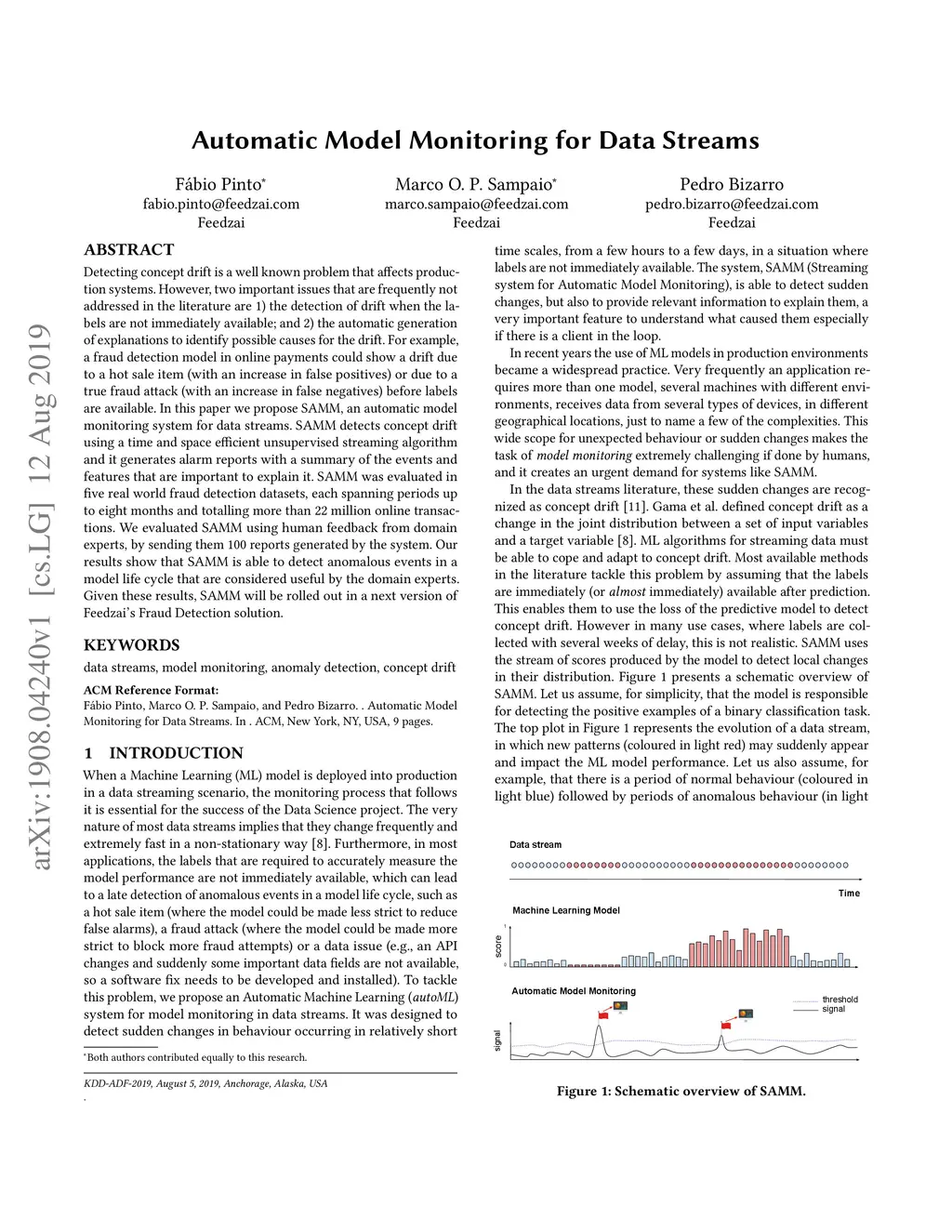 Detecting concept drift is a well known problem that affects production systems. However, two important issues that are frequently not addressed in the literature are 1) the detection of drift when the labels are not immediately available; and 2) the automatic generation of explanations to identify possible causes for the drift. For example, a fraud detection model in online payments could show a drift due to a hot sale item (with an increase in false positives) or due to a true fraud attack (with an increase in false negatives) before labels are available. In this paper we propose SAMM, an automatic model monitoring system for data streams. SAMM detects concept drift using a time and space efficient unsupervised streaming algorithm and it generates alarm reports with a summary of the events and features that are important to explain it. SAMM was evaluated in five real world fraud detection datasets, each spanning periods up to eight months and totaling more than 22 million online transactions. We evaluated SAMM using human feedback from domain experts, by sending them 100 reports generated by the system. Our results show that SAMM is able to detect anomalous events in a model life cycle that are considered useful by the domain experts. Given these results, SAMM will be rolled out in a next version of Feedzai's Fraud Detection solution.