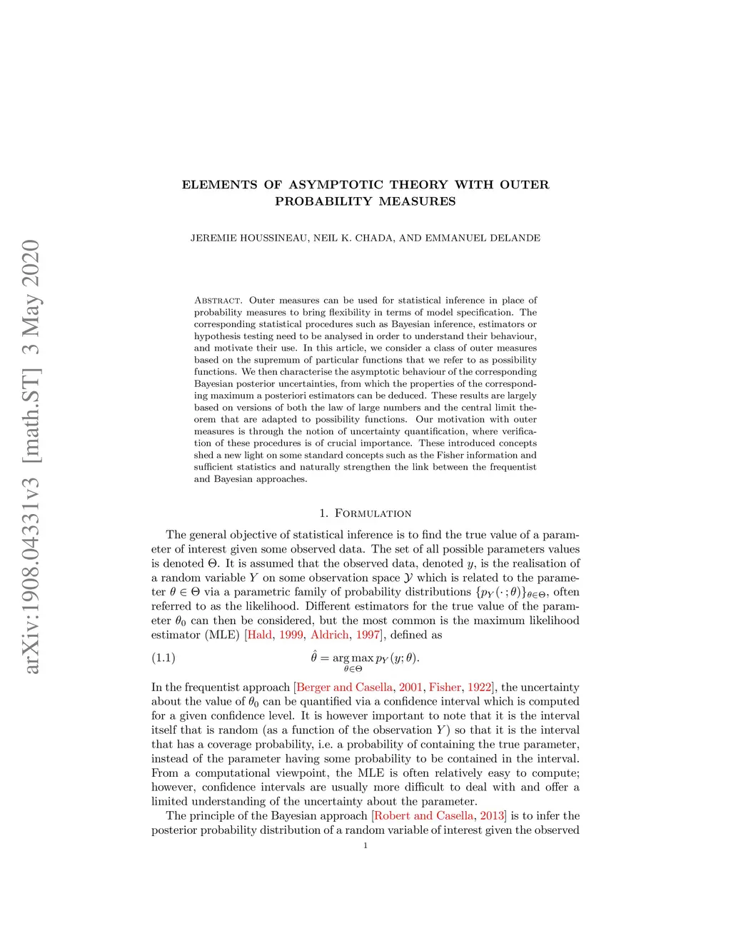 Outer measures can be used for statistical inference in place of probability measures to bring flexibility in terms of model specification. The corresponding statistical procedures such as estimation or hypothesis testing need to be analysed in order to understand their behaviour, and motivate their use. In this article, we consider a simple class of outer measures based on the supremum of particular functions that we refer to as possibility functions. We then derive the asymptotic properties of the corresponding maximum likelihood estimators, likelihood ratio tests and Bayesian posterior uncertainties. These results are largely based on versions of both the law of large numbers and the central limit theorem that are adapted to possibility functions. Our motivation with outer measures is through the notion of uncertainty quantification, where verification of these procedures is of crucial importance. These introduced concepts naturally strengthen the link between the frequentist and Bayesian approaches.